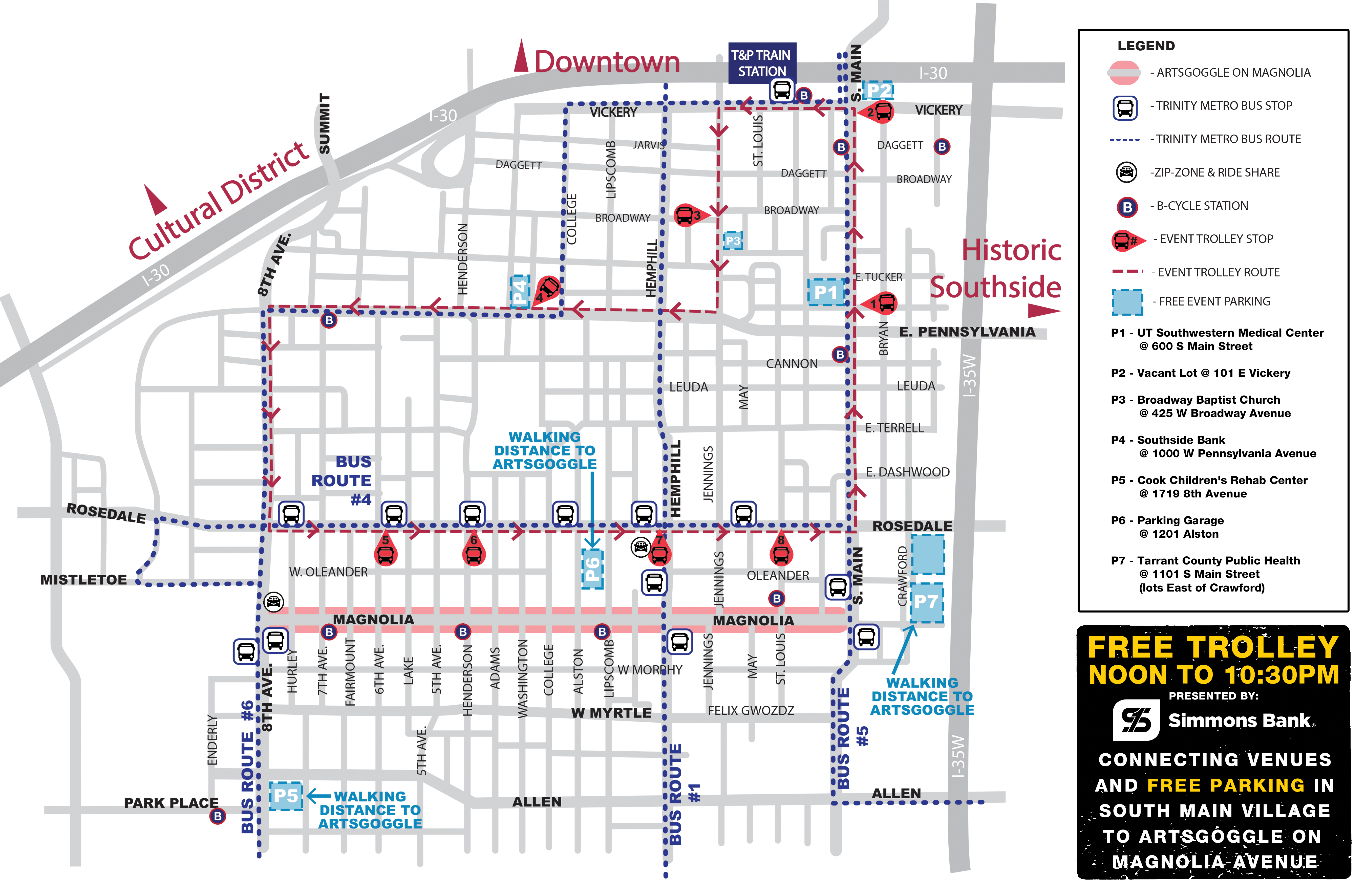 Follow the RED ARROWS to ride the Simmons Bank ArtsGoggle Trolley to Magnolia Avenue from free public parking areas in South Main Village! Then, ride back to South Main Village to enjoy shops, dining, and entertainment occurring all throughout the Near Southside district on ArtsGoggle day.