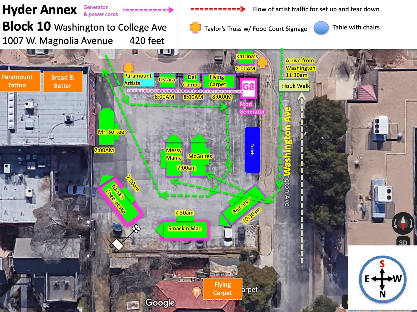 ALSO THIS BLOCK HOSTS A FOOD COURT WHICH WILL COMPLICATE ARRIVAL DUE TO LARGE FOOD TRUCKS AND TRAILERS ARRIVING - THEY HAVE BEEN ASSIGNED AN EXTRA EARLY ARRIVAL TO HELP COMPENSATE FOR THE FLOW