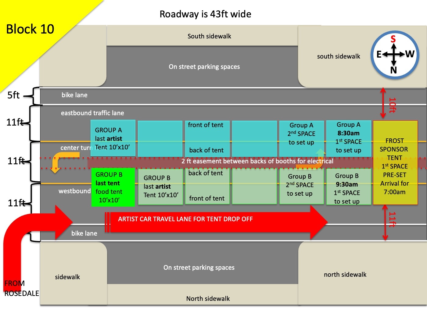 Because of the high volume of car traffic set up will entail, we will be staggering the ARTIST ARRIVAL TIMES in two groups. Please understand that despite your arrival time or your arrival order SPONSOR AND FOOD TENTS have a guarantee to the endcaps they are promised and as they are shown on the map. That means that if a sponsor tent is a bit behind in setting up they will still have the ability to set up on the ends. Please refer to your maps accordingly.