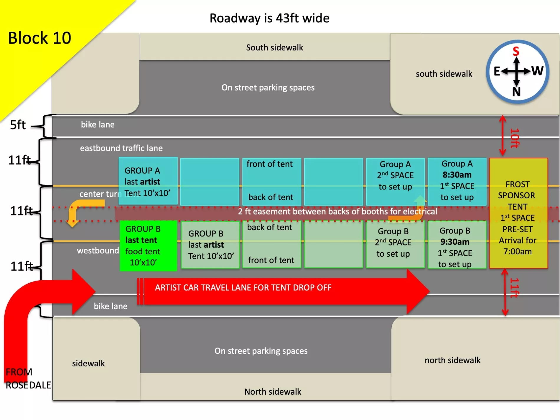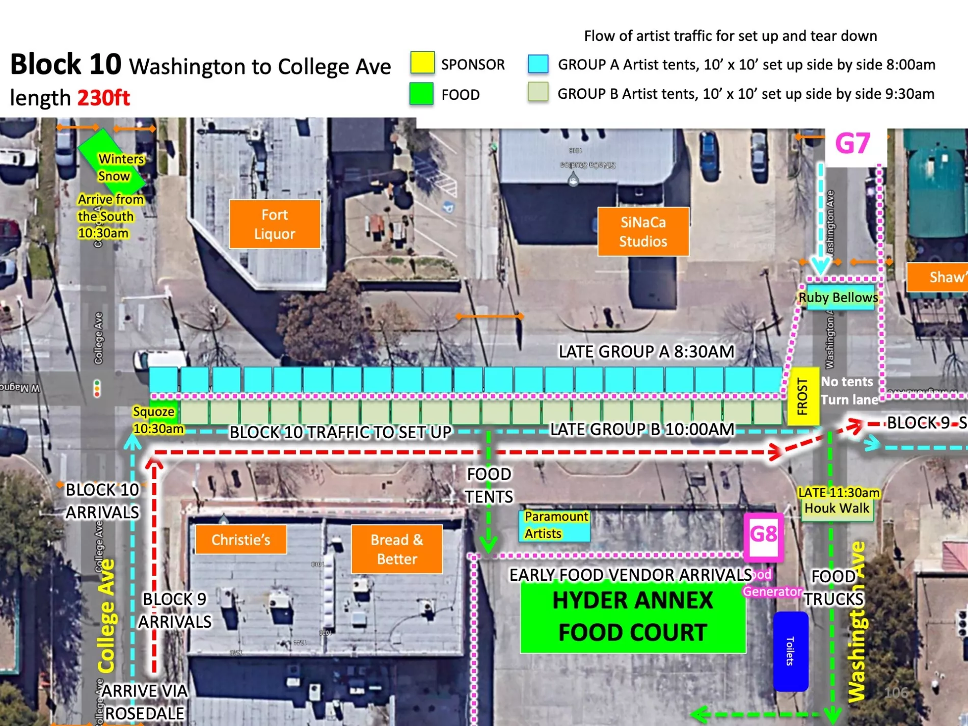 7:00am FOOD COURT are invited and encouraged to arrive extra early to set-up and get out of the way of the crush of artist traffic that will begin at 7:30am when Blocks 9 and 10 begin loading in on College Avenue. If you CAN arrive extra early, please do. It'll help you and us have a smoother arrival.