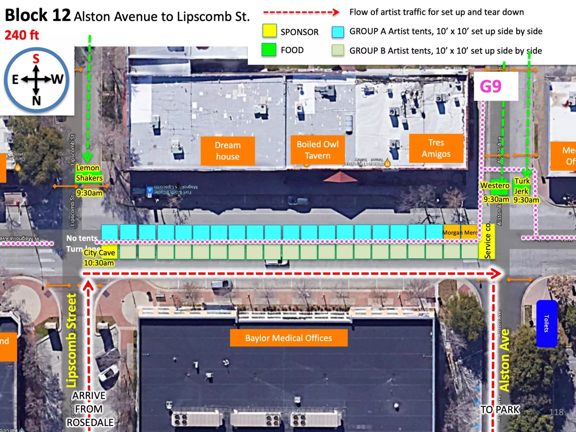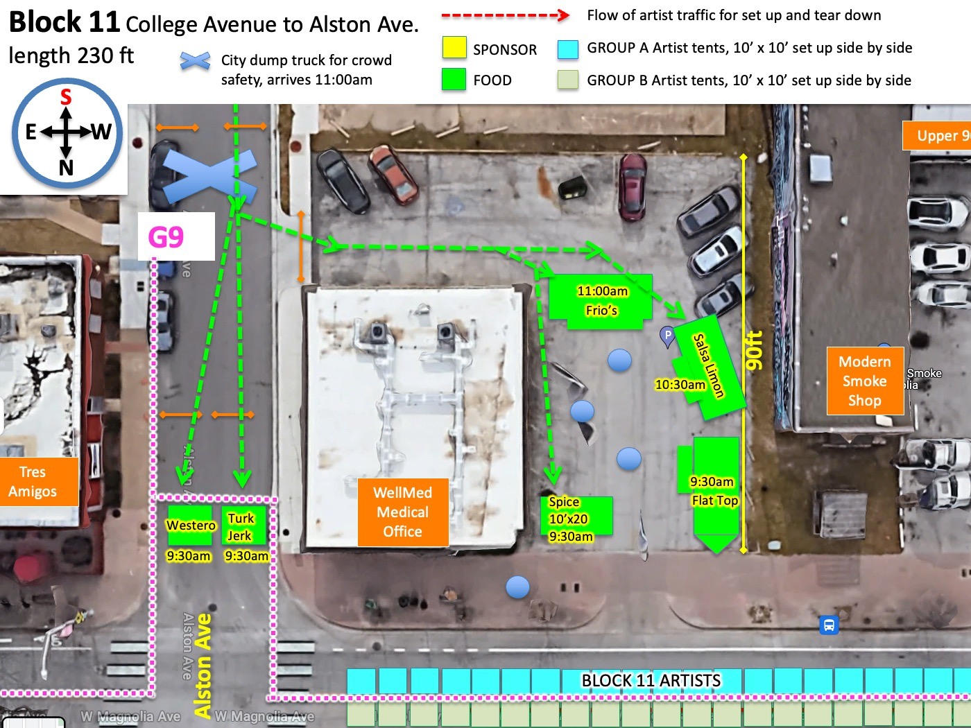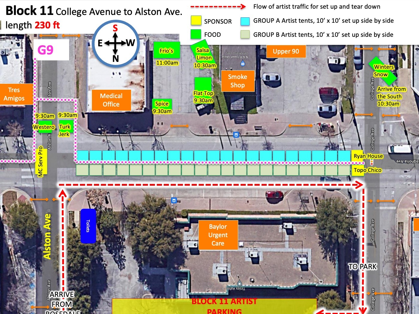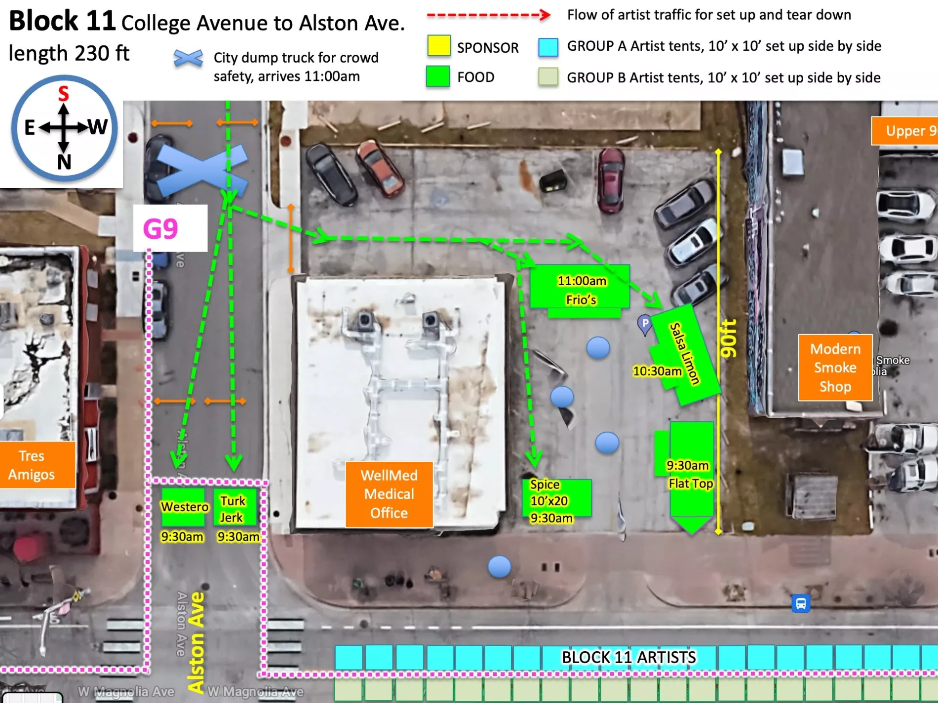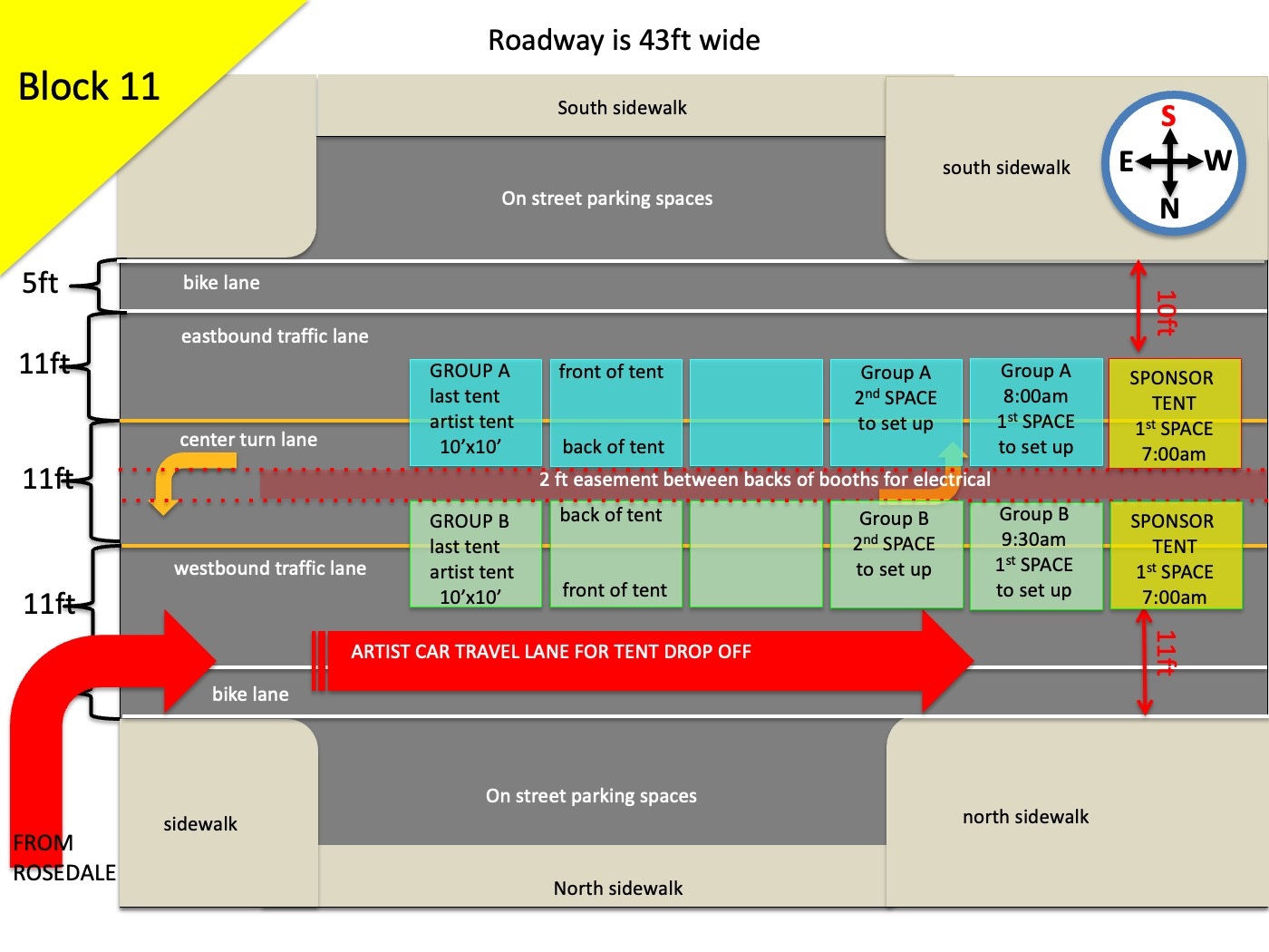 Because of the high volume of car traffic set up will entail, we will be staggering the ARTIST ARRIVAL TIMES in two groups. Please understand that despite your arrival time or your arrival order SPONSOR AND FOOD TENTS have a guarantee to the endcaps they are promised and as they are shown on the map. That means that if a sponsor tent is a bit behind in setting up they will still have the ability to set up on the ends. Please refer to your maps accordingly.