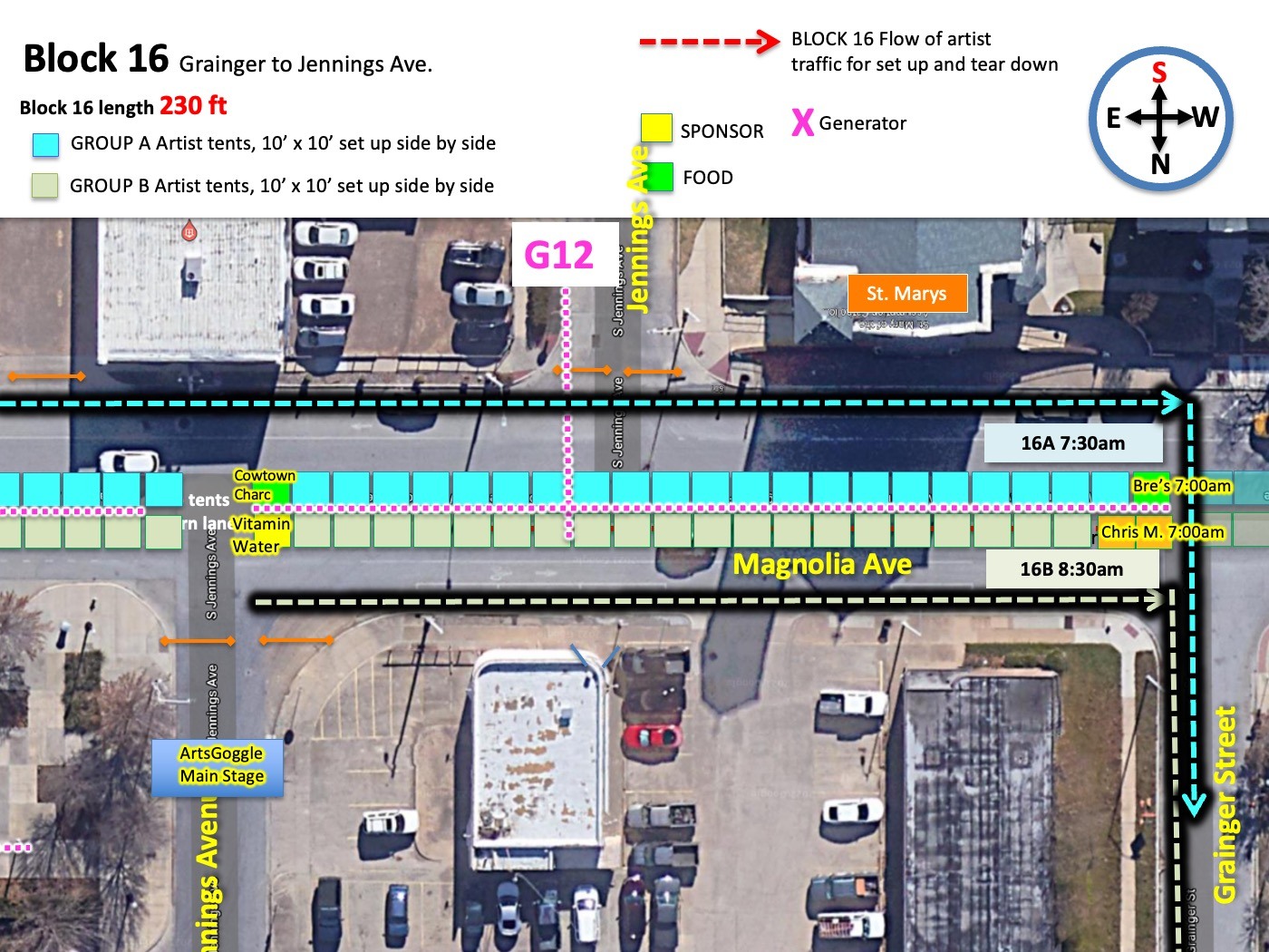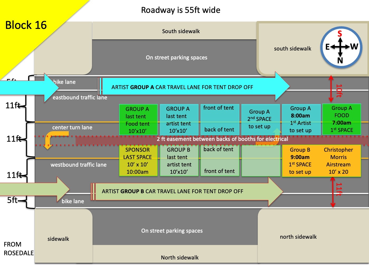 - BLOCK 16 GROUP B FIRST VENDOR TO ARRIVE IS CHRISTOPHER MORRIS IN AN AIRSTEAM TRAILER - Chris this is the same plan that you always have for ArtsGoggle, however there is a bit more chaos behind you. Arrive early if you'd like to ensure you clean and clear arrival path. You will occupy the first two booth spaces of the street.