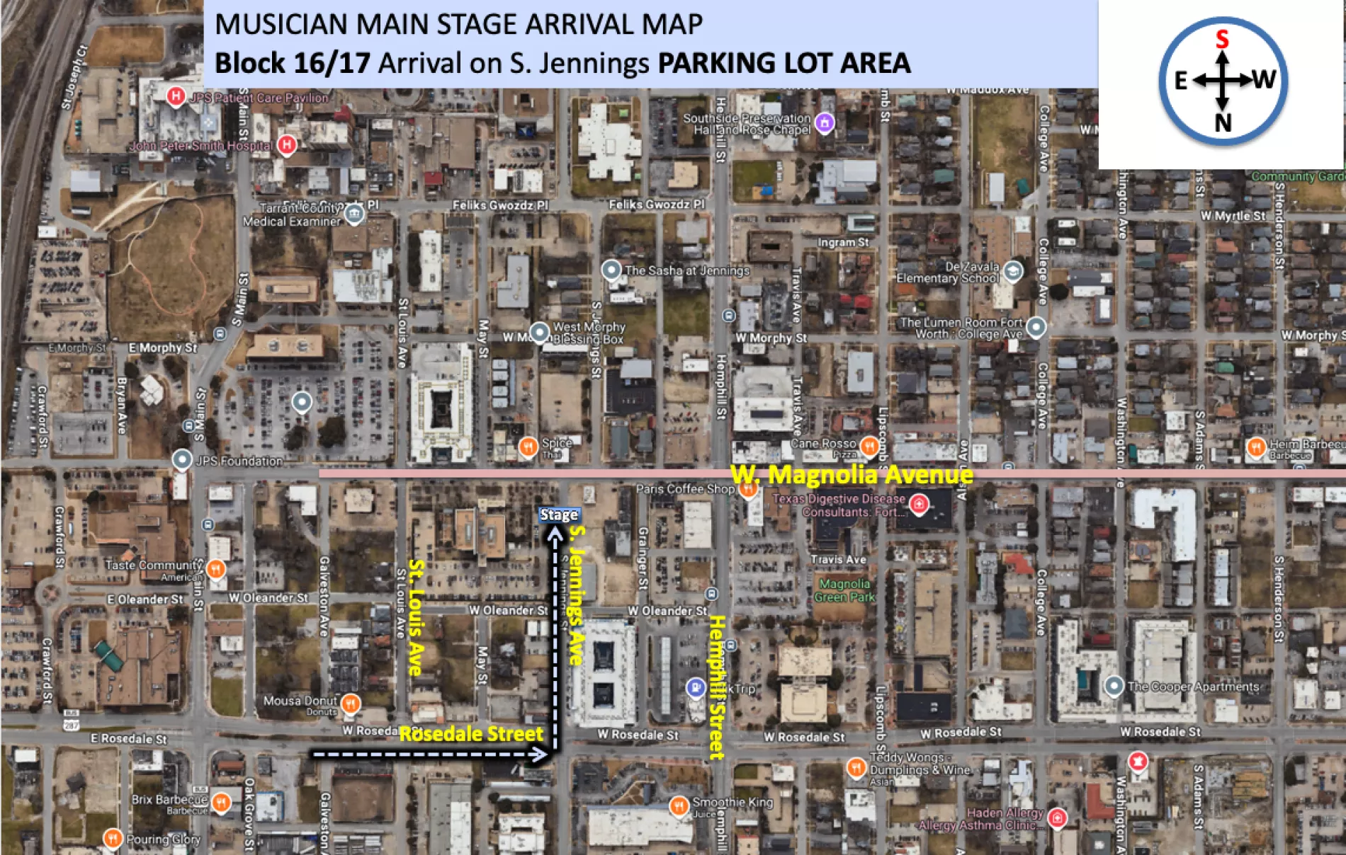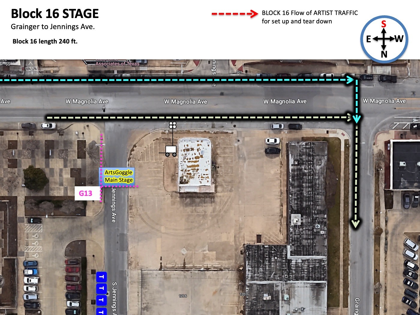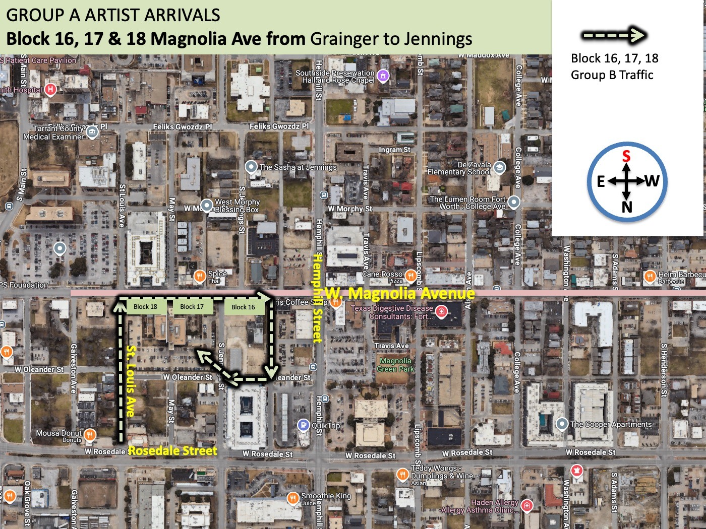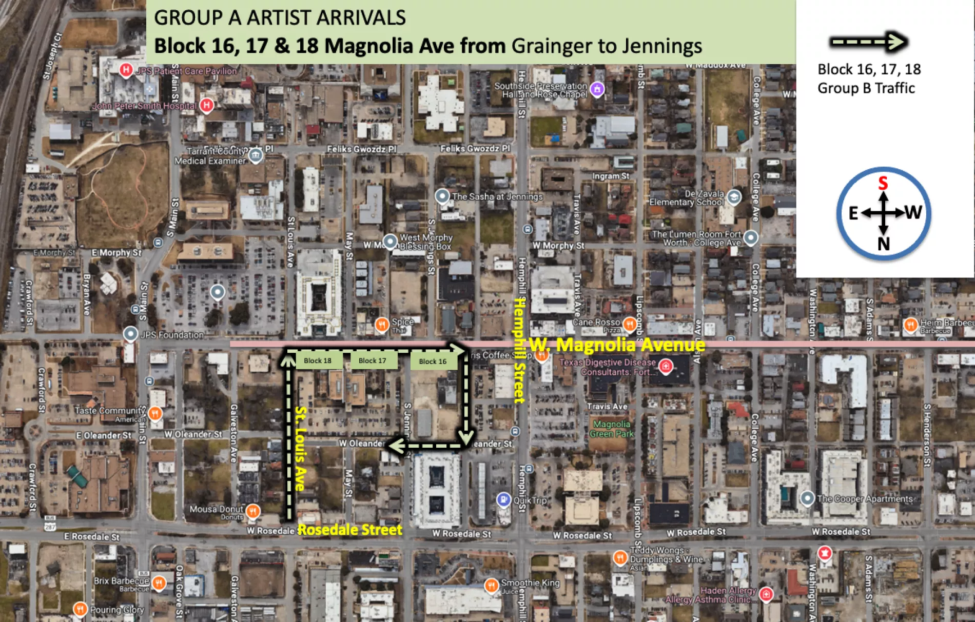 - Blocks 16, 17, and 18 Group B artists will arrive from the NORTH TURNING SOUTH ONTO YOUR ARRIVAL STREET. The preferred arrival pattern is to take W. Rosedale Blvd, turning south onto St. Louis Avenue and driving until you reach the W. Magnolia Avenue barricade. This is the traditional arrival plan that all other artists use (Rosedale driving on your arrival street to Magnolia)