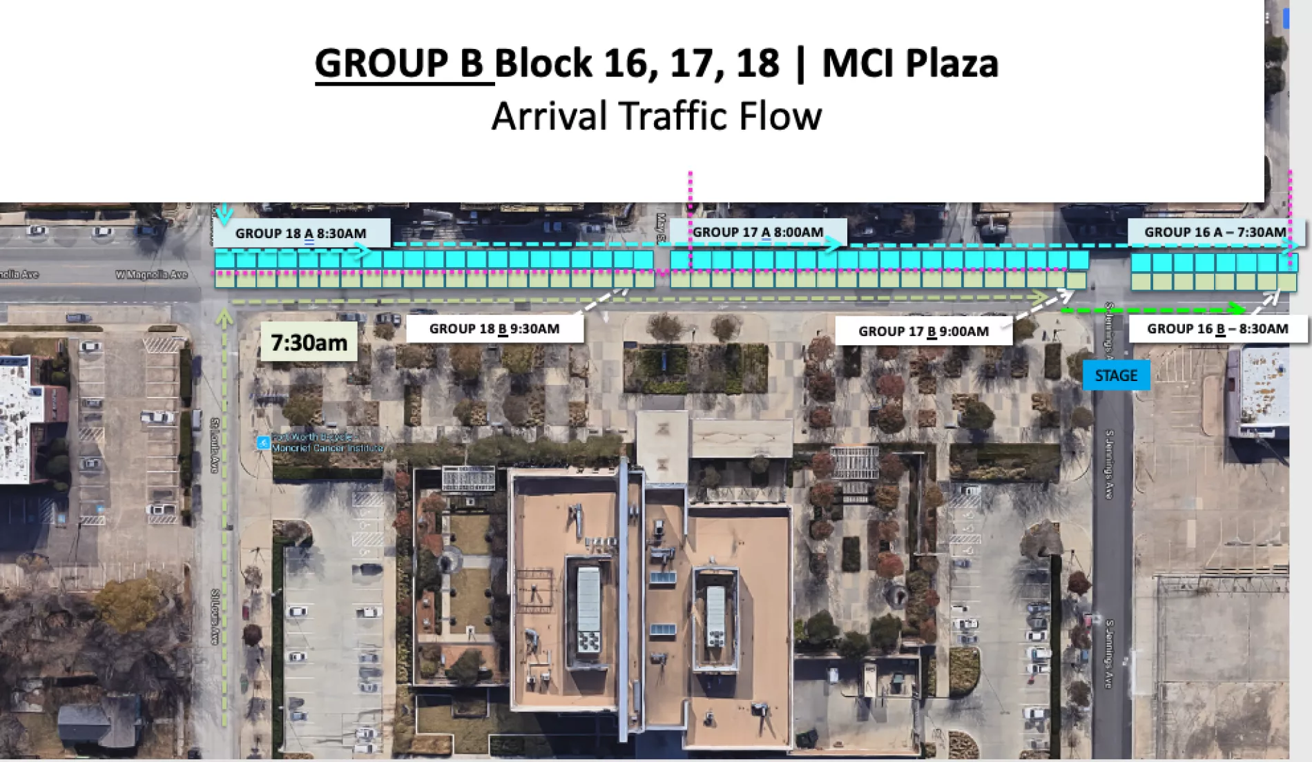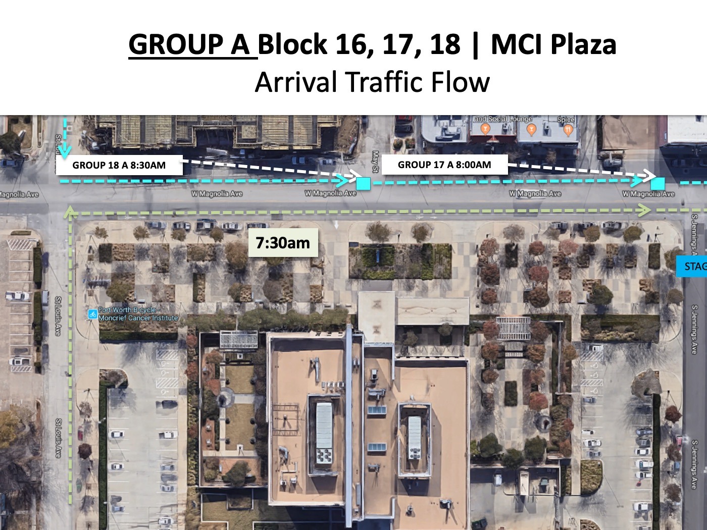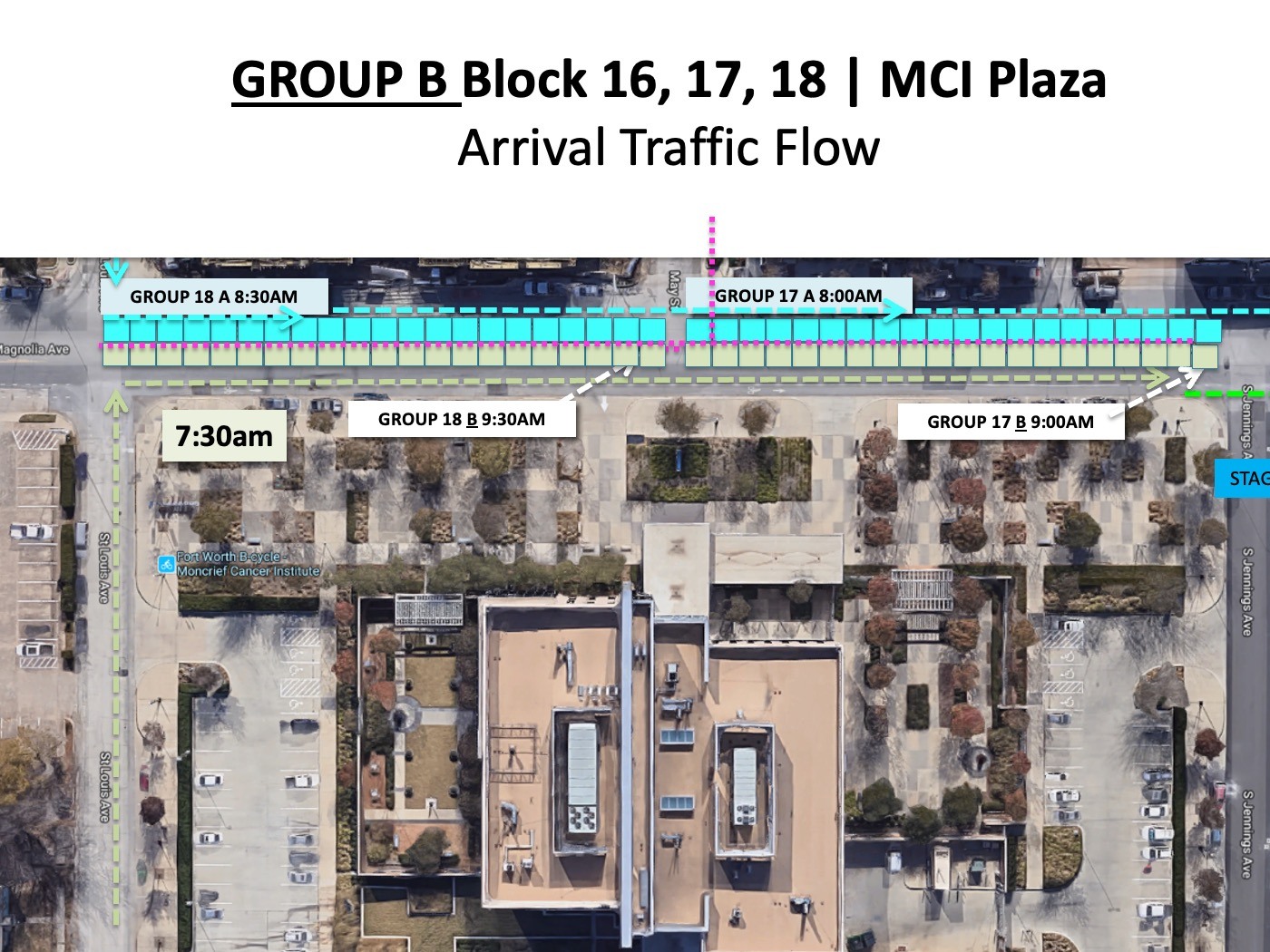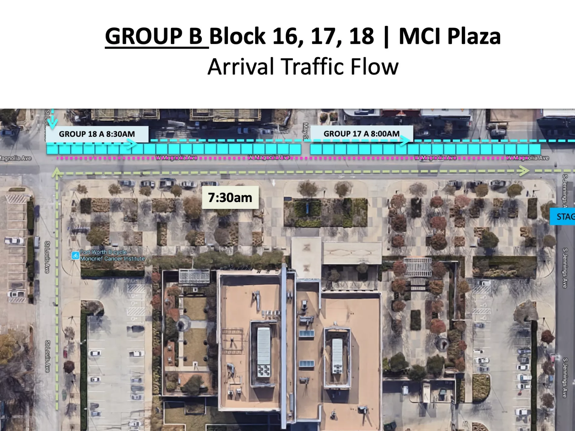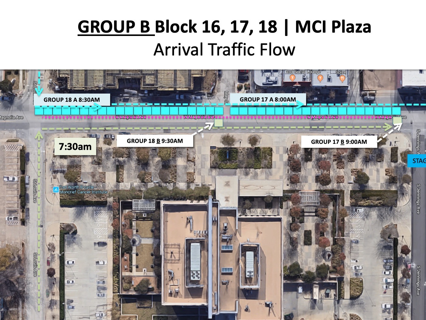 Group B for all three blocks will arrive using the same street, St. Louis Ave. COMING FROM NORTH of Magnolia.