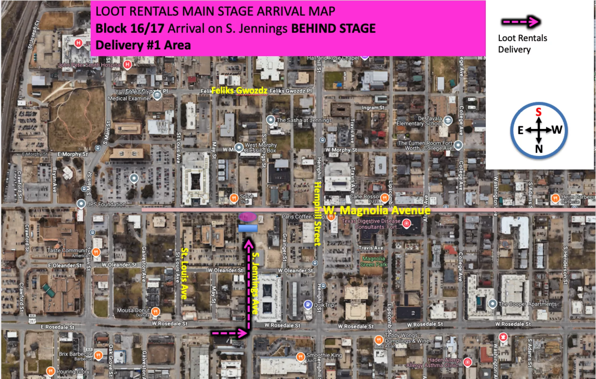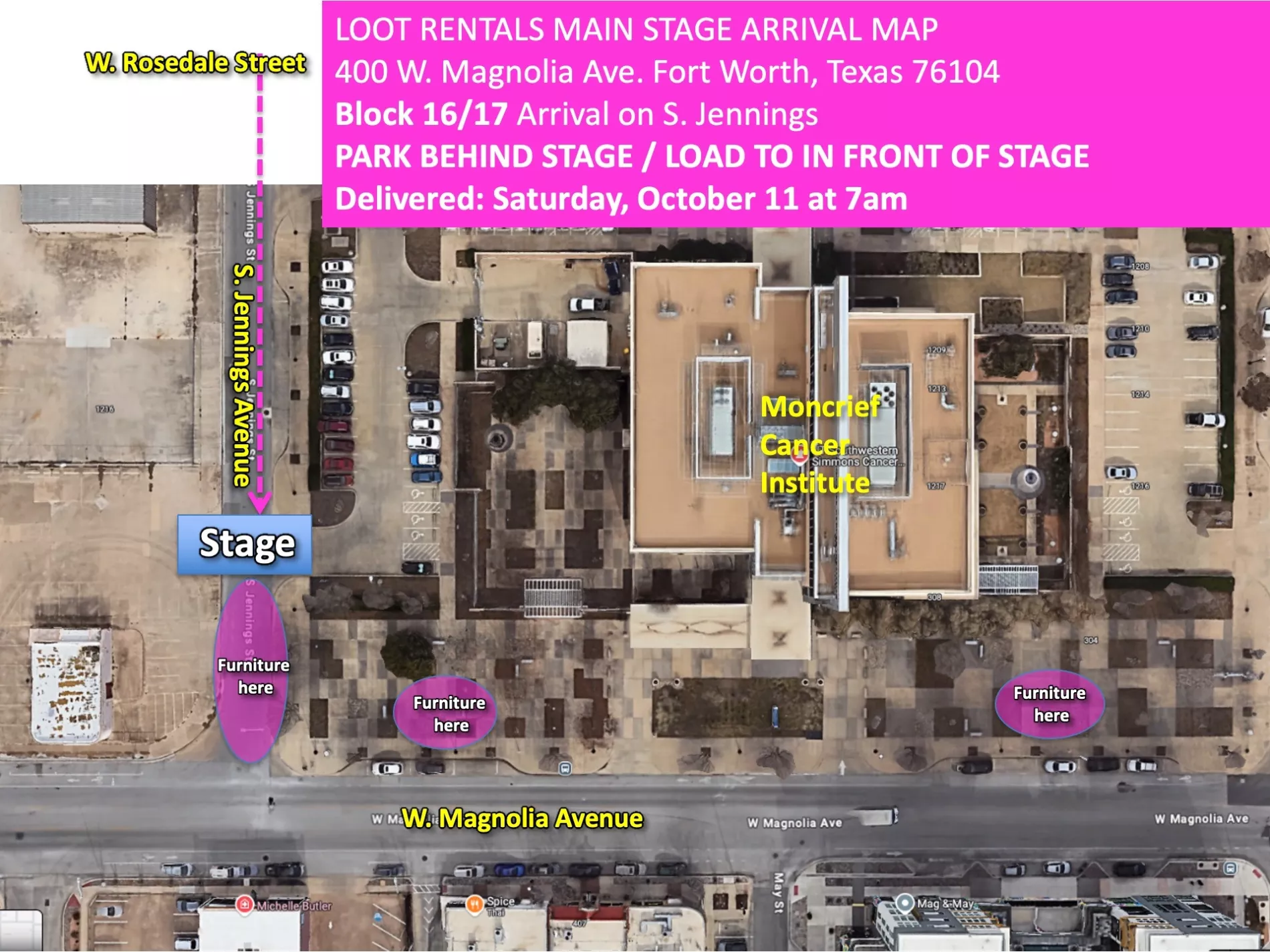 - LOOT RENTALS FURNITURE DELIVERY ON S. JENNINGS AVENUE - Loot will arrive early, 7:00am, using their own arrival maps allowing them to pull directly onto S. Jennings Avenue (same as band arrivals and mineral water arrivals) so that their furniture delivery box truck can park behind the stage to unload all of our beautiful rented furniture for the MCI Plaza and front of stage listening area. They will hopefully be able to unload and depart before any band arrivals begin and possibly even before mineral water arrives for their late set-up.
