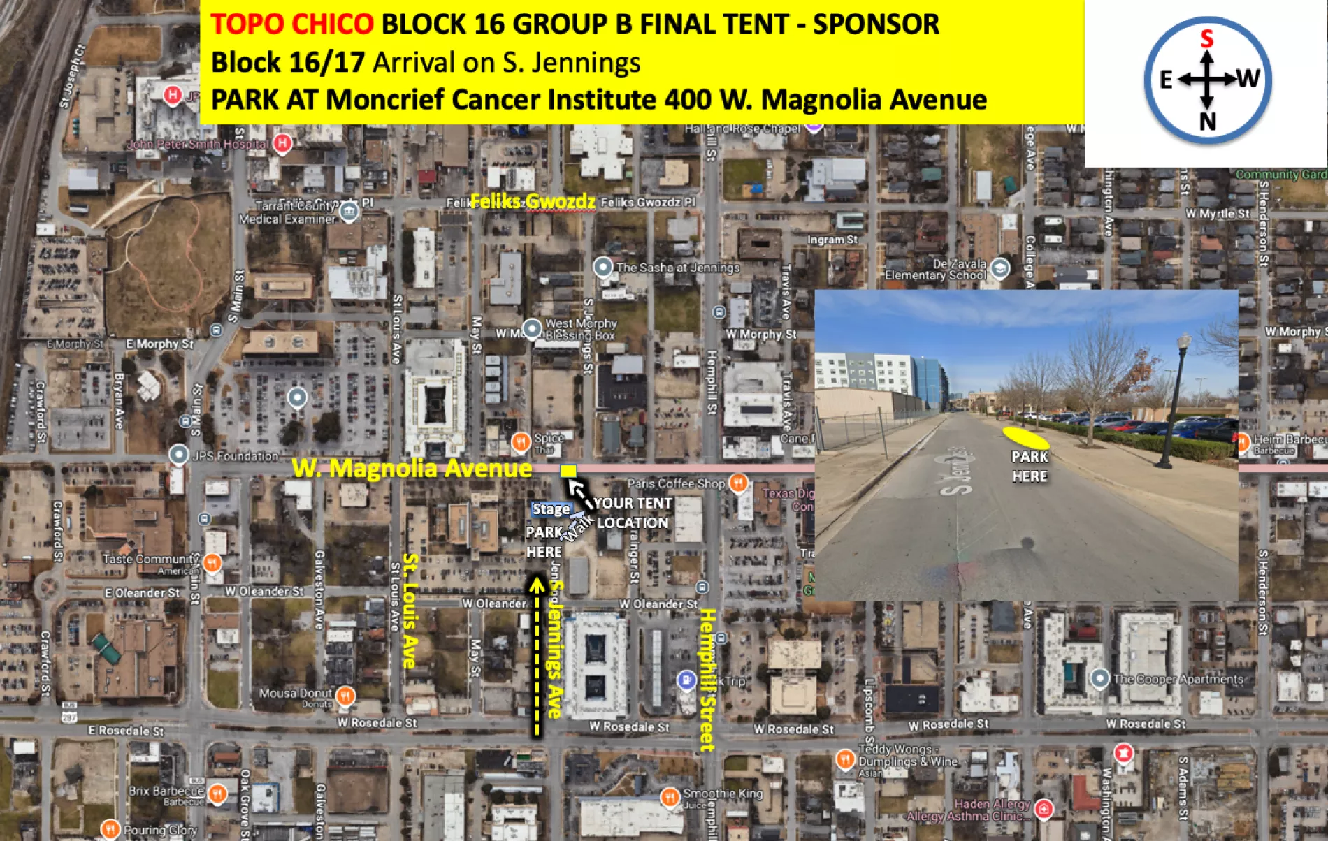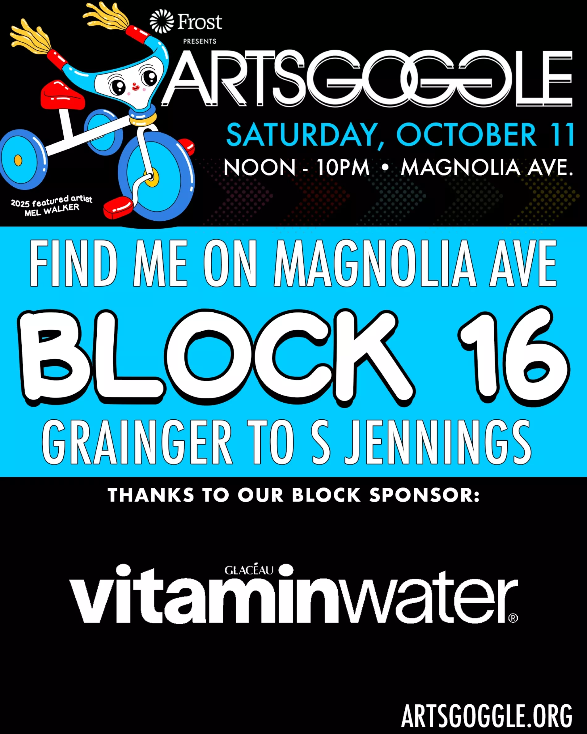 - BLOCK 16 SPONSOR - Topo Chico/Vitamin Water is the sponsor for Block 16 and will arrive as the LAST TENT in the Block 16 Group B arrivals. Instead of following the artist traffic flow, Vitamin Water has been given exclusive permission to arrive using S. Jennings, behind the ArtsGoggle Main Stage, parking their supplies van on the on street parking space behind the stage in the band loading zone. This will take careful coordination with the ArtsGoggle East Main Stage emcee Tony Diaz and Stage Manager Brooks Kendall. Please coordinate directly with them for arrival. Artists in Block 16 Group B, please know that no matter what time Mineral Water arrives they are entitled to the east end-cap of Block 16.