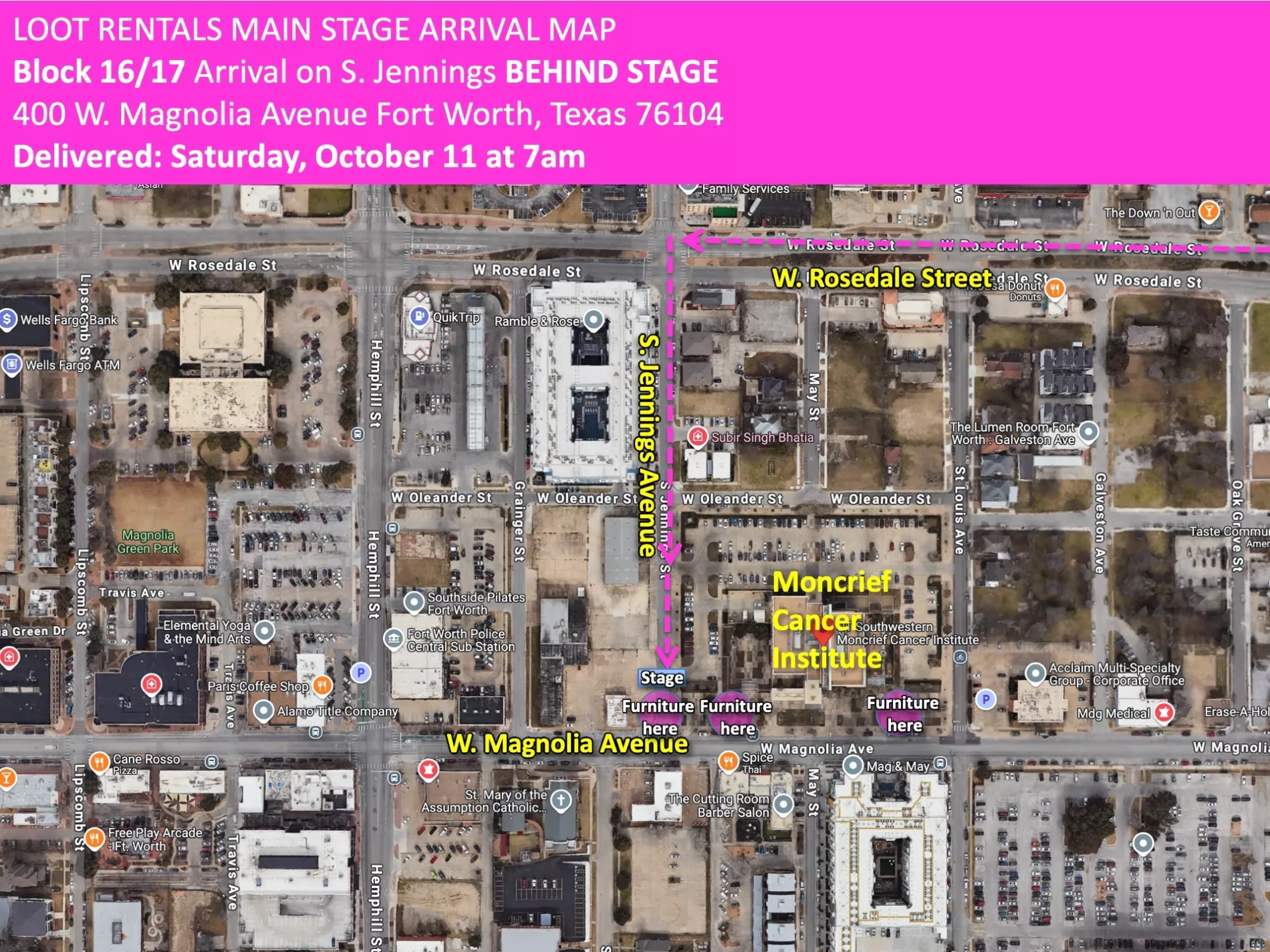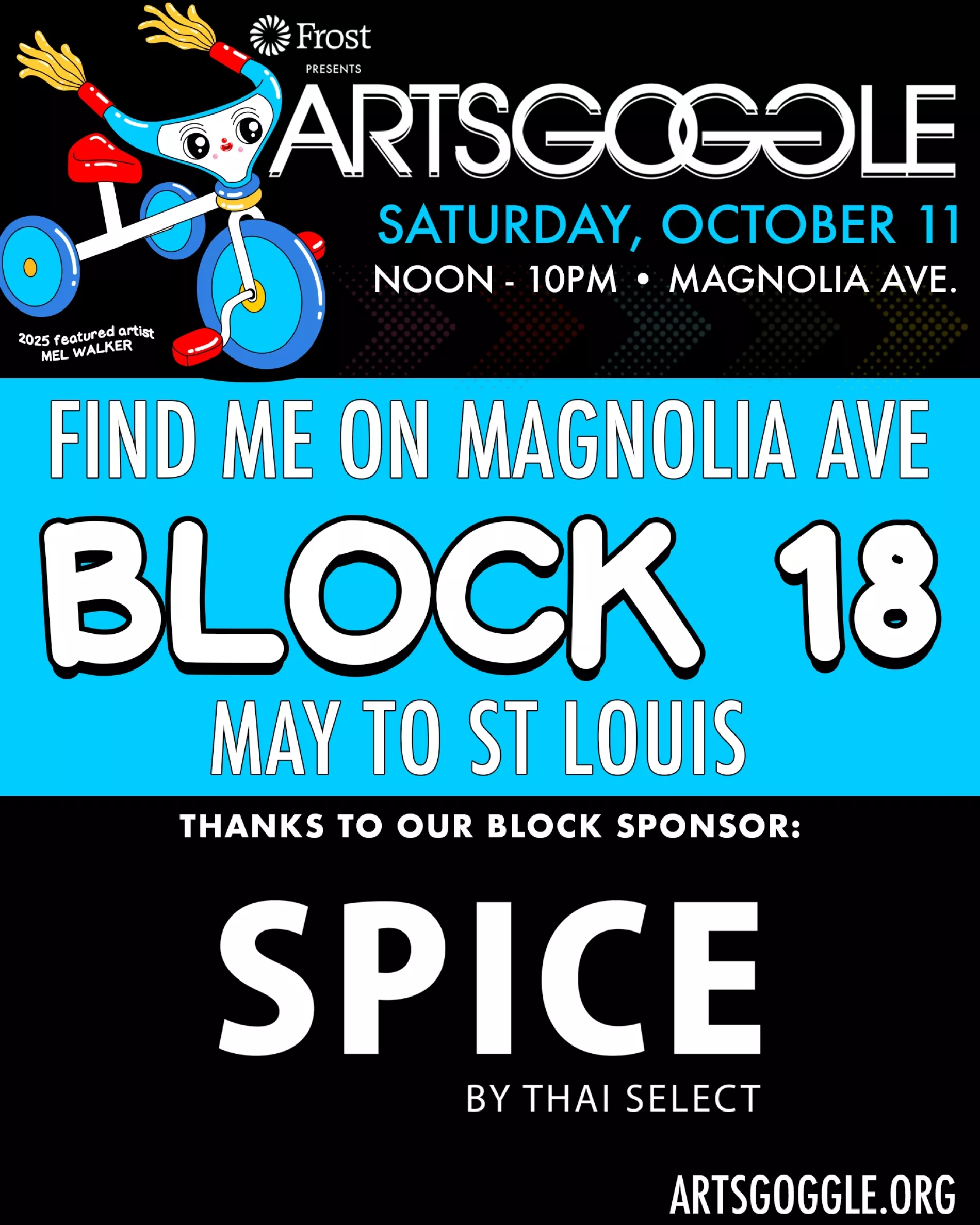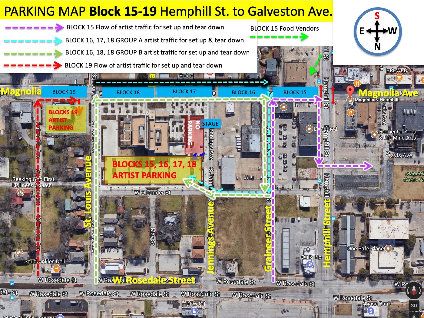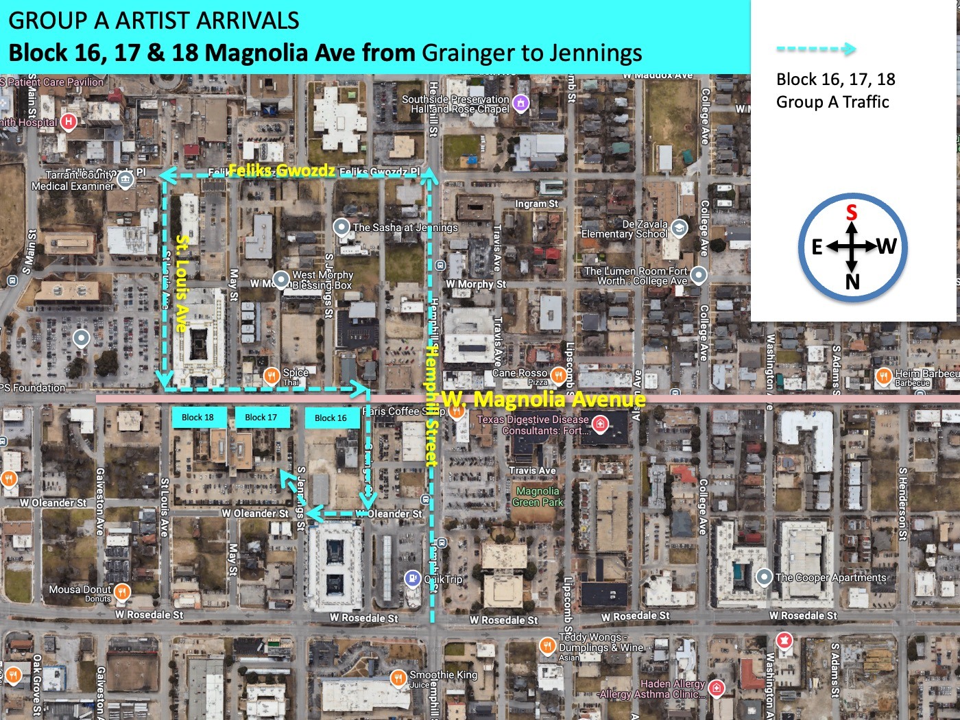 YOU ARE THE ONLY ARTISTS OF THE ENTIRE FESTIVAL THAT ARRIVE FROM THE SOUTH. Your routes will require you to arrive via a weird little street named Feliks Gwodz Place. In simple terms, you are arriving by skirting through the JPS Hospital campus to sneak into St. Louis Avenue FROM THE SOUTH. When you turn off of Felix Gwodz onto St. Louis Avenue you should be facing NORTH towards Magnolia Avenue.