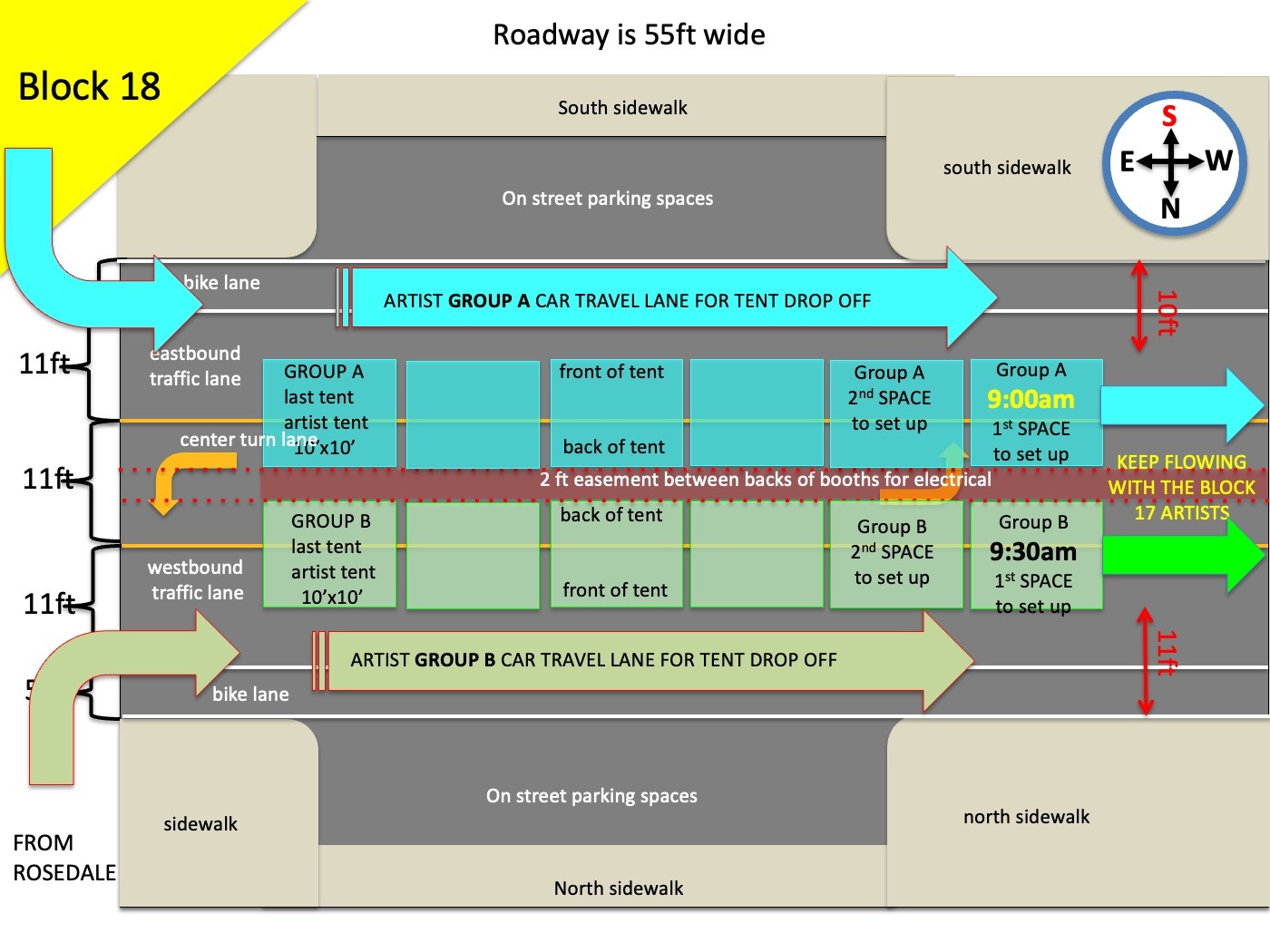 Because of the high volume of car traffic set up will entail, we will be staggering the ARTIST ARRIVAL TIMES in two groups. Please understand that despite your arrival time or your arrival order SPONSOR AND FOOD TENTS have a guarantee to the endcaps they are promised and as they are shown on the map. That means that if a sponsor tent is a bit behind in setting up they will still have the ability to set up on the ends. Please refer to your maps accordingly.