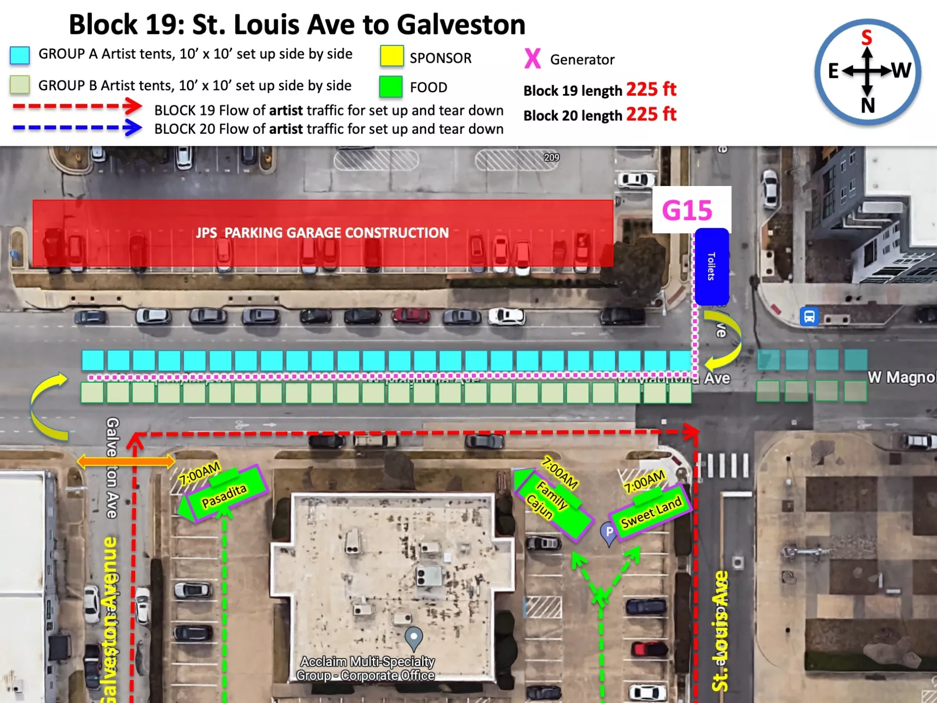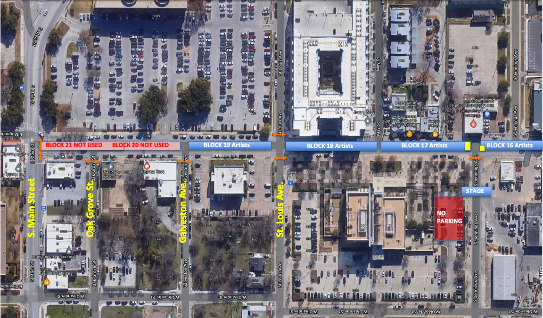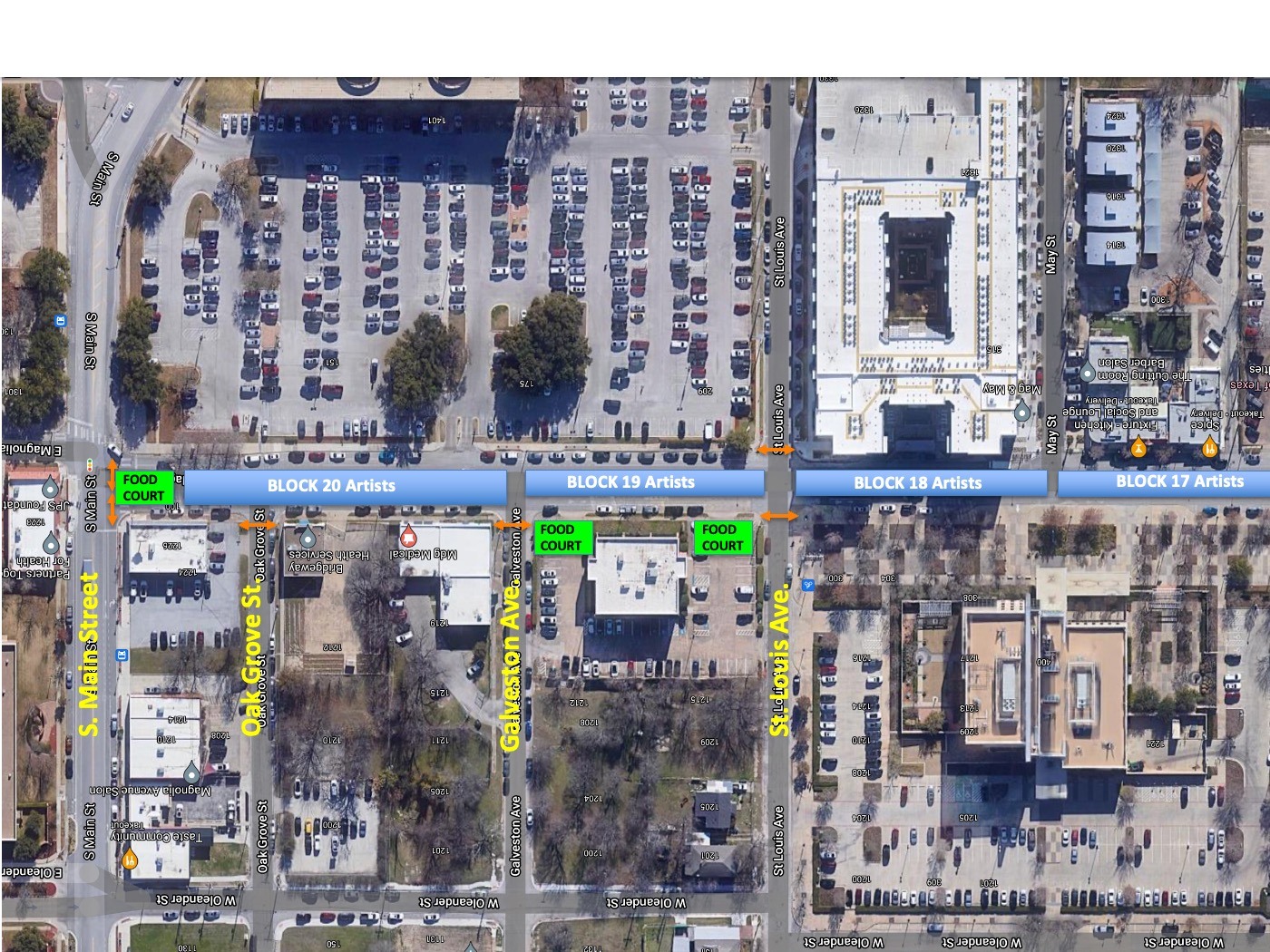It is also fair to warn you that beside you to the west blocks 16, 17 and 18 will all load in on St. Louis Avenue - your departure street - and we expect St. Louis to be CHAOTIC at best. This means you may need lots of patience with your departure as your car leaves Magnolia Avenue after set-up. Worst case scenario (which isn't bad at all) is that you wait a few minutes or your volunteer can help divert traffic off of your block into your parking lot which actually has a driveway entrance off your block. That driveway is easily accessible to all except the first few artists to set-up as their tents will come a bit further west than the driveway (again see maps)
