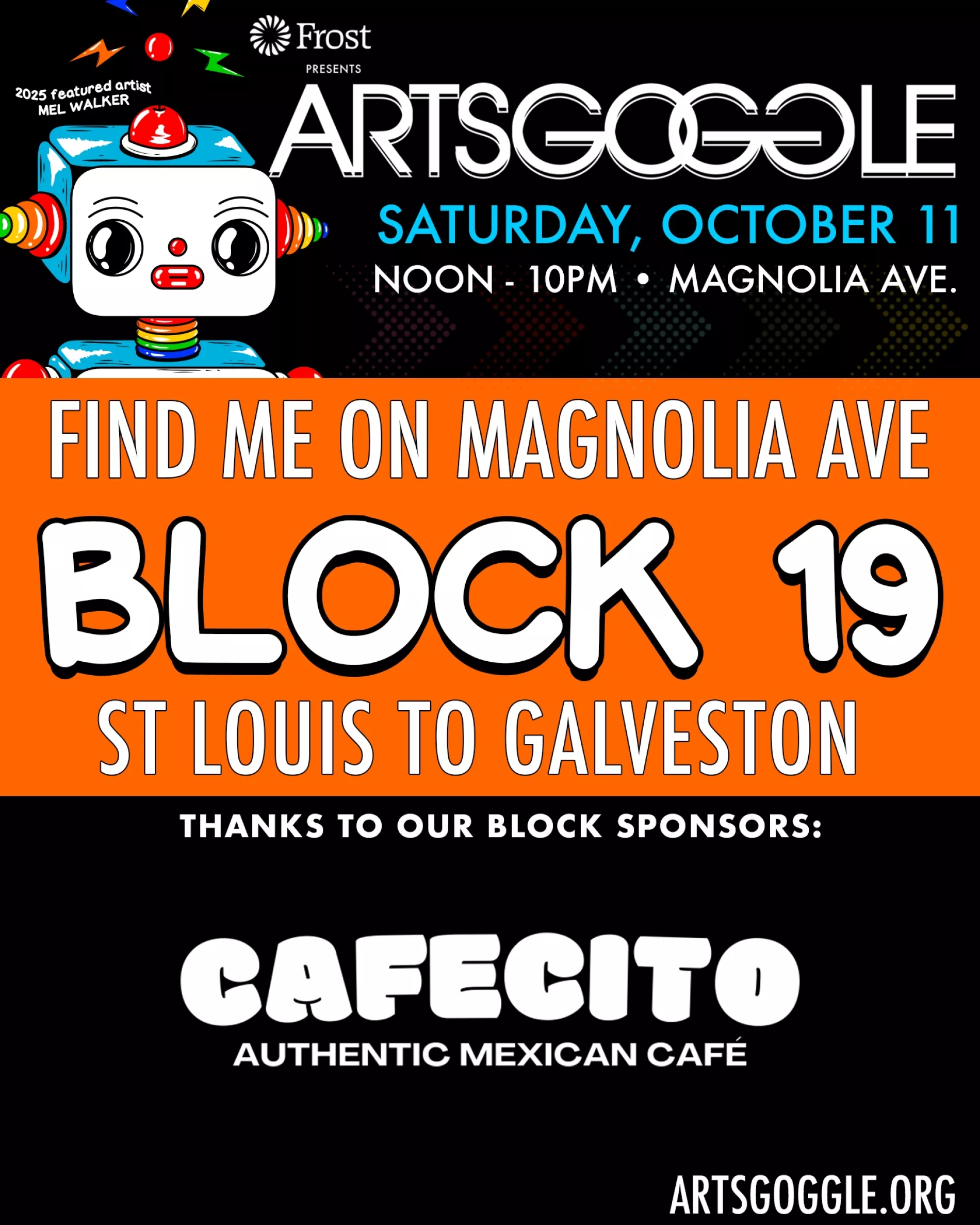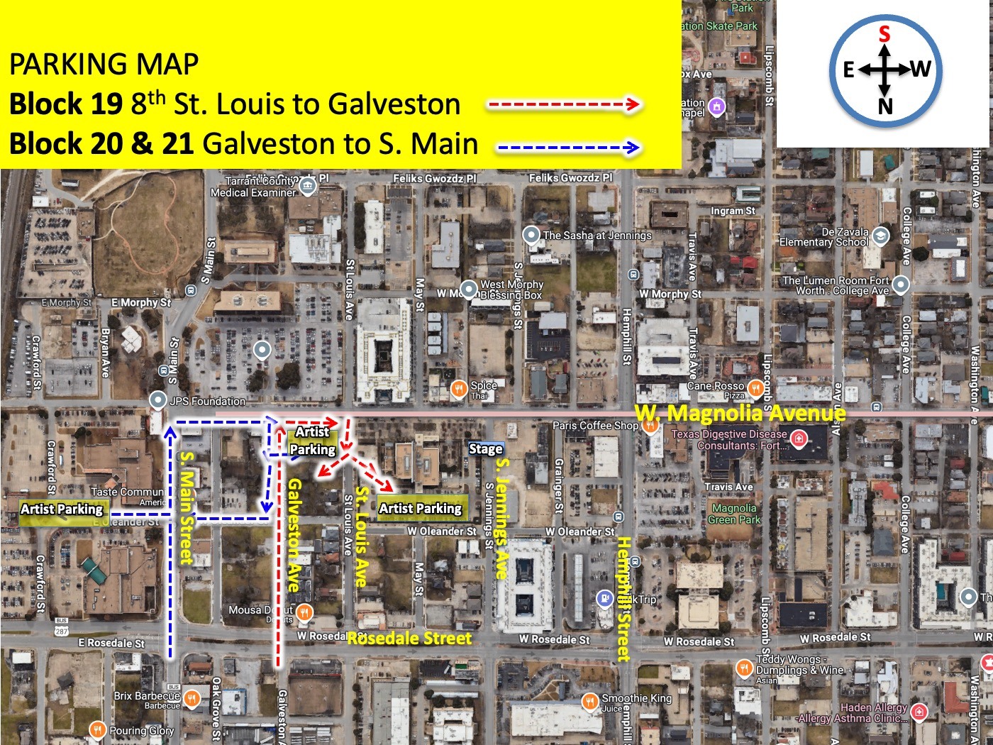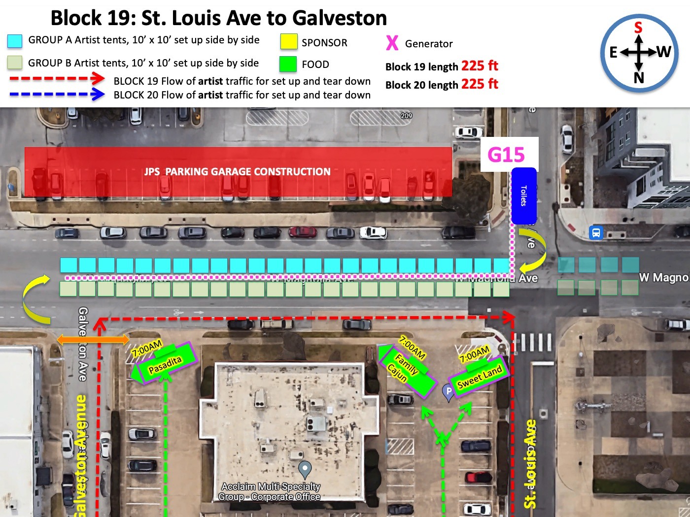 It is also fair to warn you that beside you to the west blocks 16, 17 and 18 will all load in on St. Louis Avenue - your departure street - and we expect St. Louis to be CHAOTIC at best. This means you may need lots of patience with your departure as your car leaves Magnolia Avenue after set-up. Worst case scenario (which isn't bad at all) is that you wait a few minutes or your volunteer can help divert traffic off of your block into your parking lot which actually has a driveway entrance off your block. That driveway is easily accessible to all except the first few artists to set-up as their tents will come a bit further west than the driveway (again see maps)