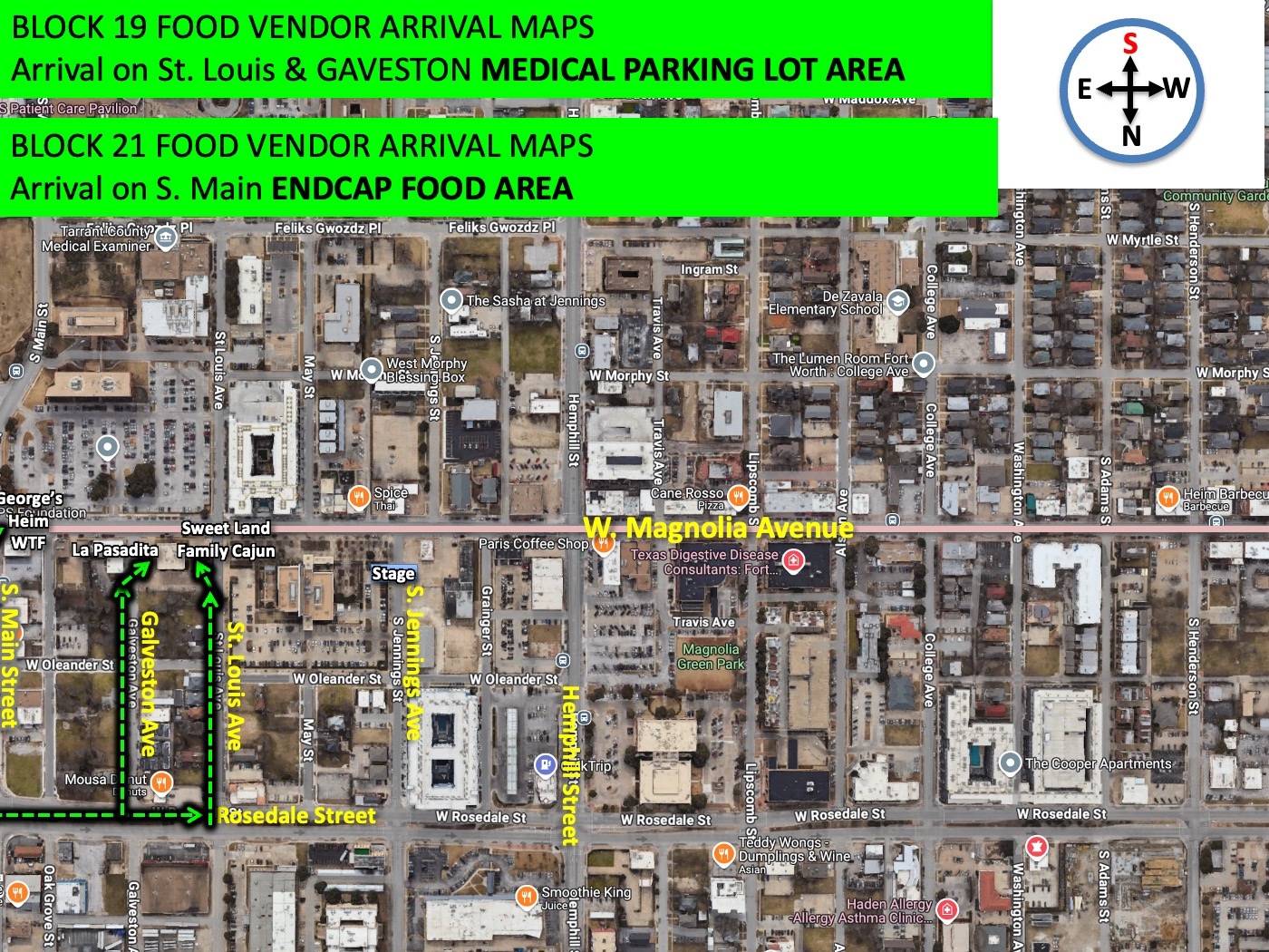 Food vendors are represented as green boxes on the site maps.