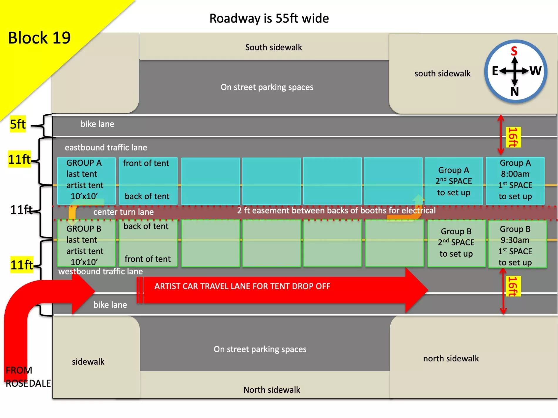 Because of the high volume of car traffic set up will entail, we will be staggering the ARTIST ARRIVAL TIMES in two groups. Please understand that despite your arrival time or your arrival order SPONSOR AND FOOD TENTS have a guarantee to the endcaps they are promised and as they are shown on the map. That means that if a sponsor tent is a bit behind in setting up they will still have the ability to set up on the ends. Please refer to your maps accordingly.