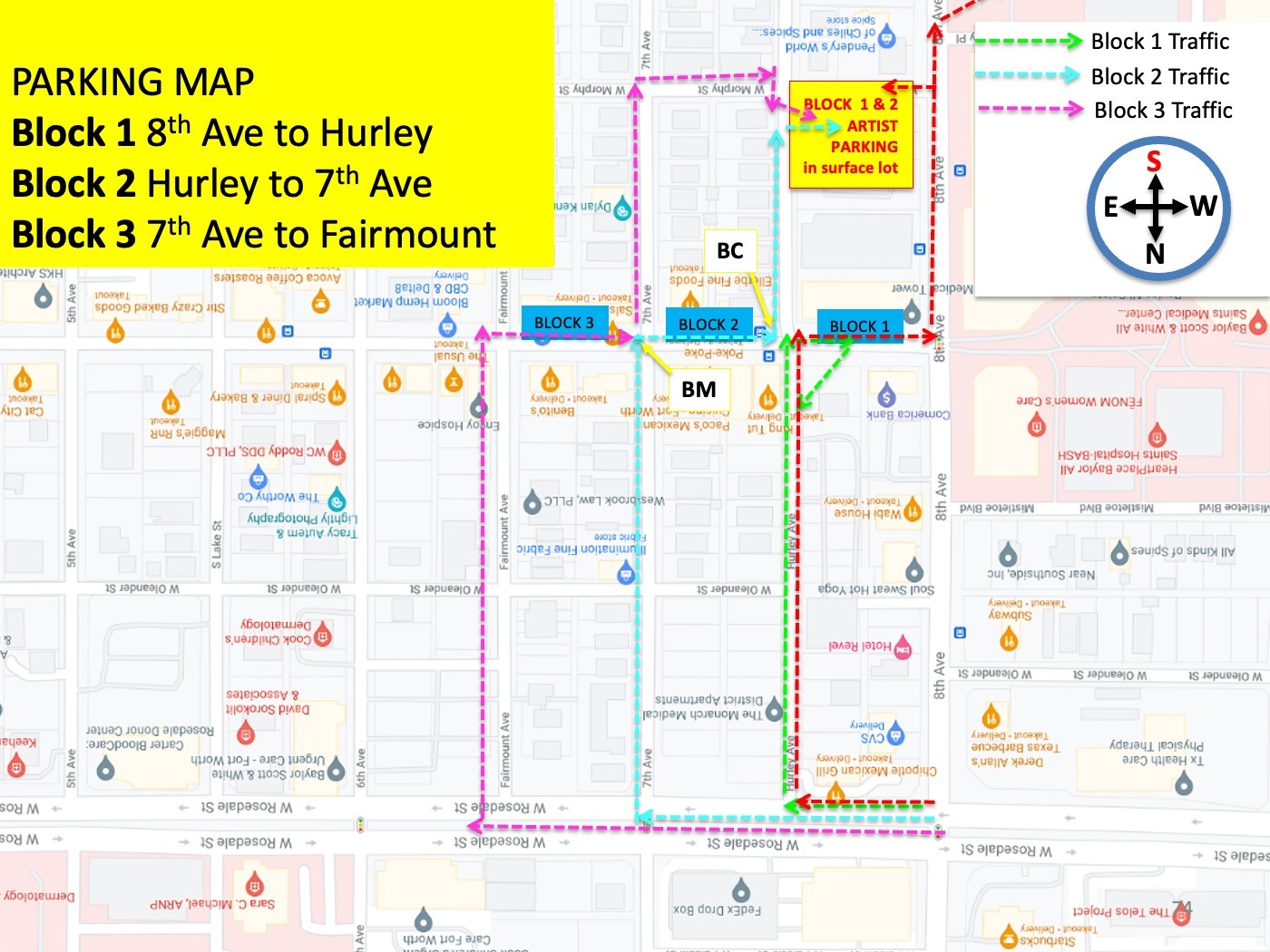 This may feel odd to look at now but when you are driving you will be looking at the map in the very same direction you are pointed in your car. The example maps that we will share here explain how to arrive and what the street will look like to you AS YOU ARRIVE. The maps are facing the same direction (facing south) that your car will be facing (facing south) as you arrive. This is similar to the way that your Apple Map or Google Map will automatically orient itself as you drive, these maps are intentionally oriented to your driving view.