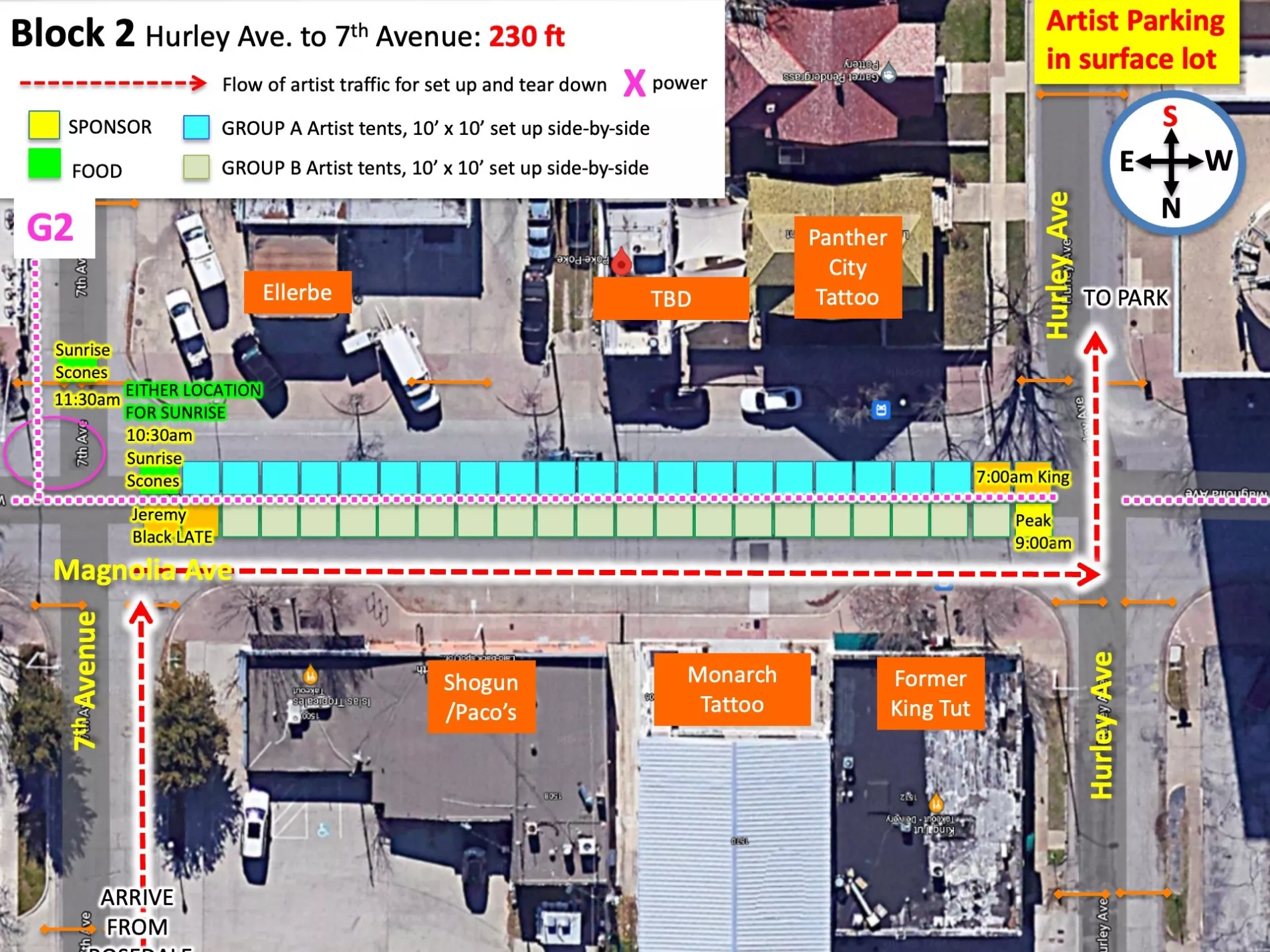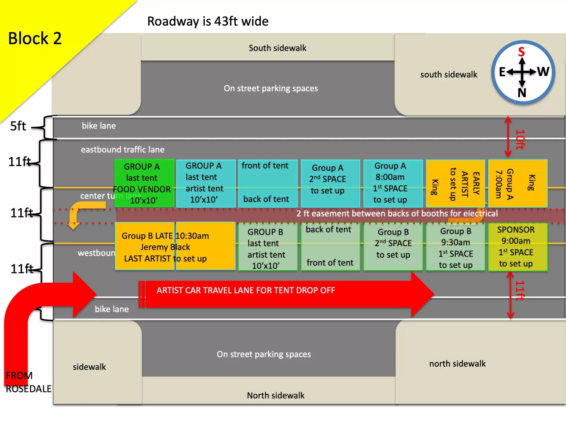 Because of the high volume of car traffic set up will entail, we will be staggering the ARTIST ARRIVAL TIMES in two groups. Please understand that despite your arrival time or your arrival order SPONSOR AND FOOD TENTS have a guarantee to the endcaps they are promised and as they are shown on the map. That means that if a sponsor tent is a bit behind in setting up they will still have the ability to set up on the ends. Please refer to your maps accordingly.