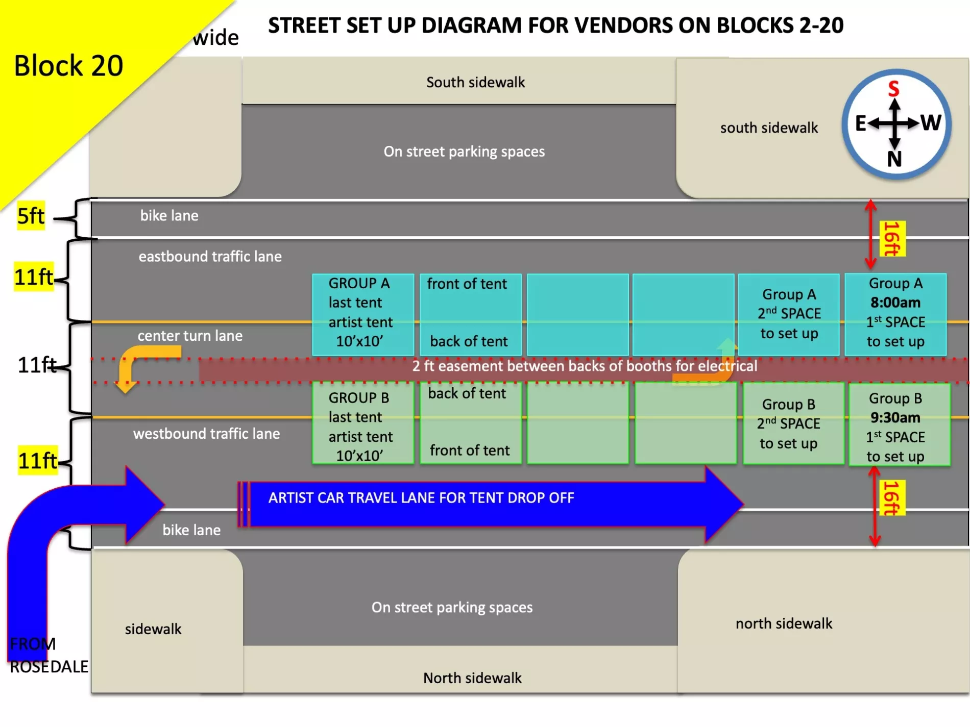 Because of the high volume of car traffic set up will entail, we will be staggering the ARTIST ARRIVAL TIMES in two groups. Please understand that despite your arrival time or your arrival order SPONSOR AND FOOD TENTS have a guarantee to the endcaps they are promised and as they are shown on the map. That means that if a sponsor tent is a bit behind in setting up they will still have the ability to set up on the ends. Please refer to your maps accordingly.