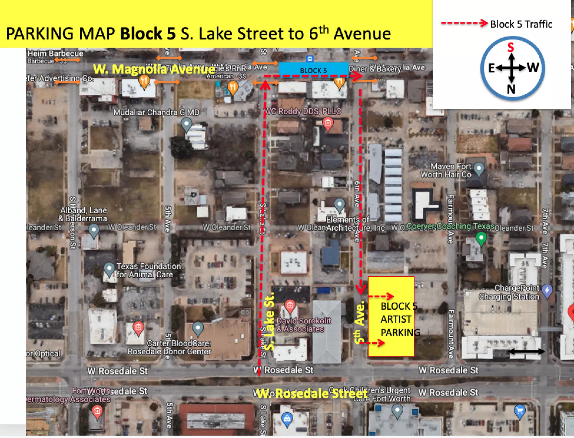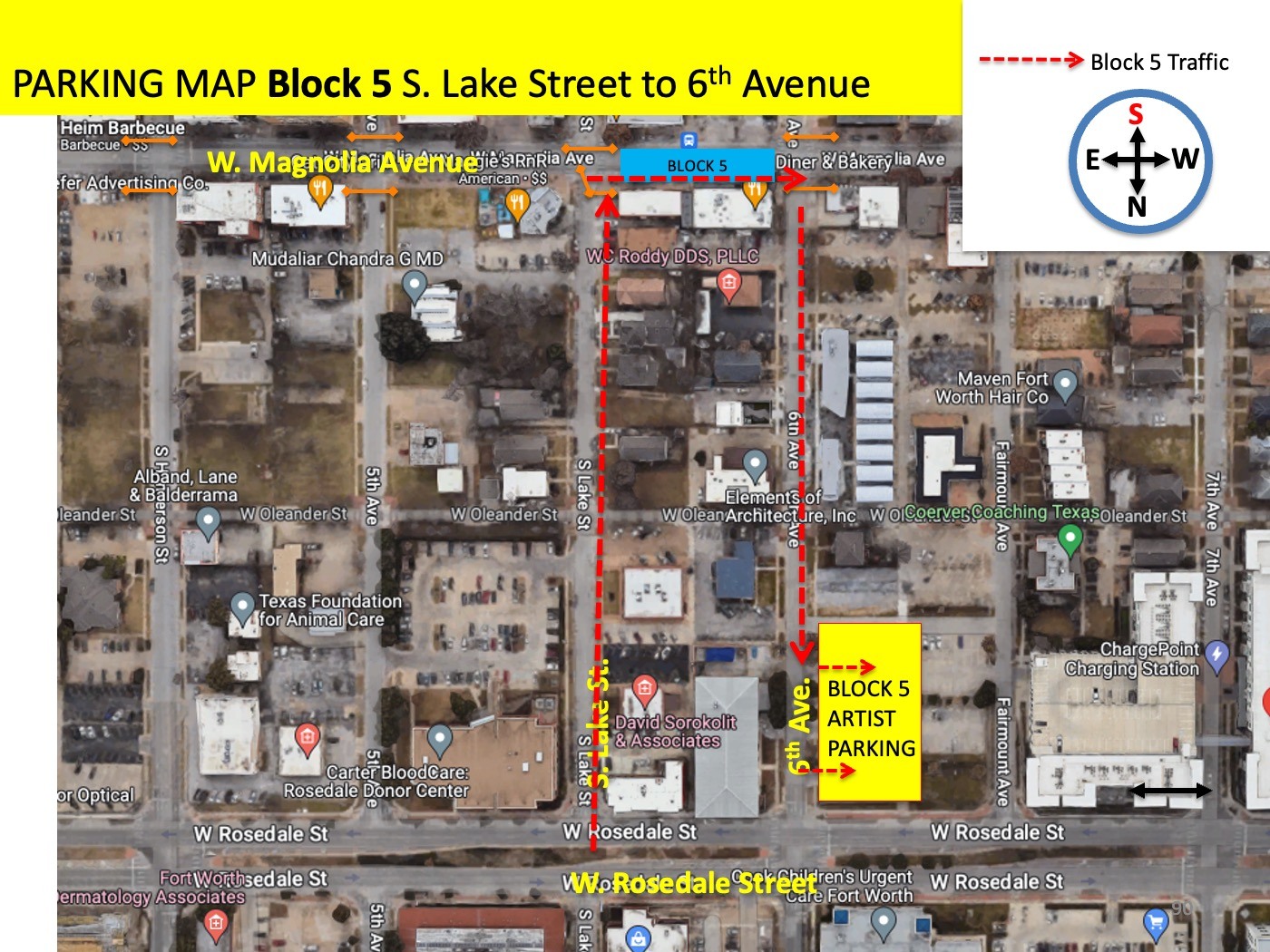 This may feel odd to look at now but when you are driving you will be looking at the map in the very same direction you are pointed in your car. The example maps that we will share here explain how to arrive and what the street will look like to you AS YOU ARRIVE. The maps are facing the same direction (facing south) that your car will be facing (facing south) as you arrive. This is similar to the way that your Apple Map or Google Map will automatically orient itself as you drive, these maps are intentionally oriented to your driving view.