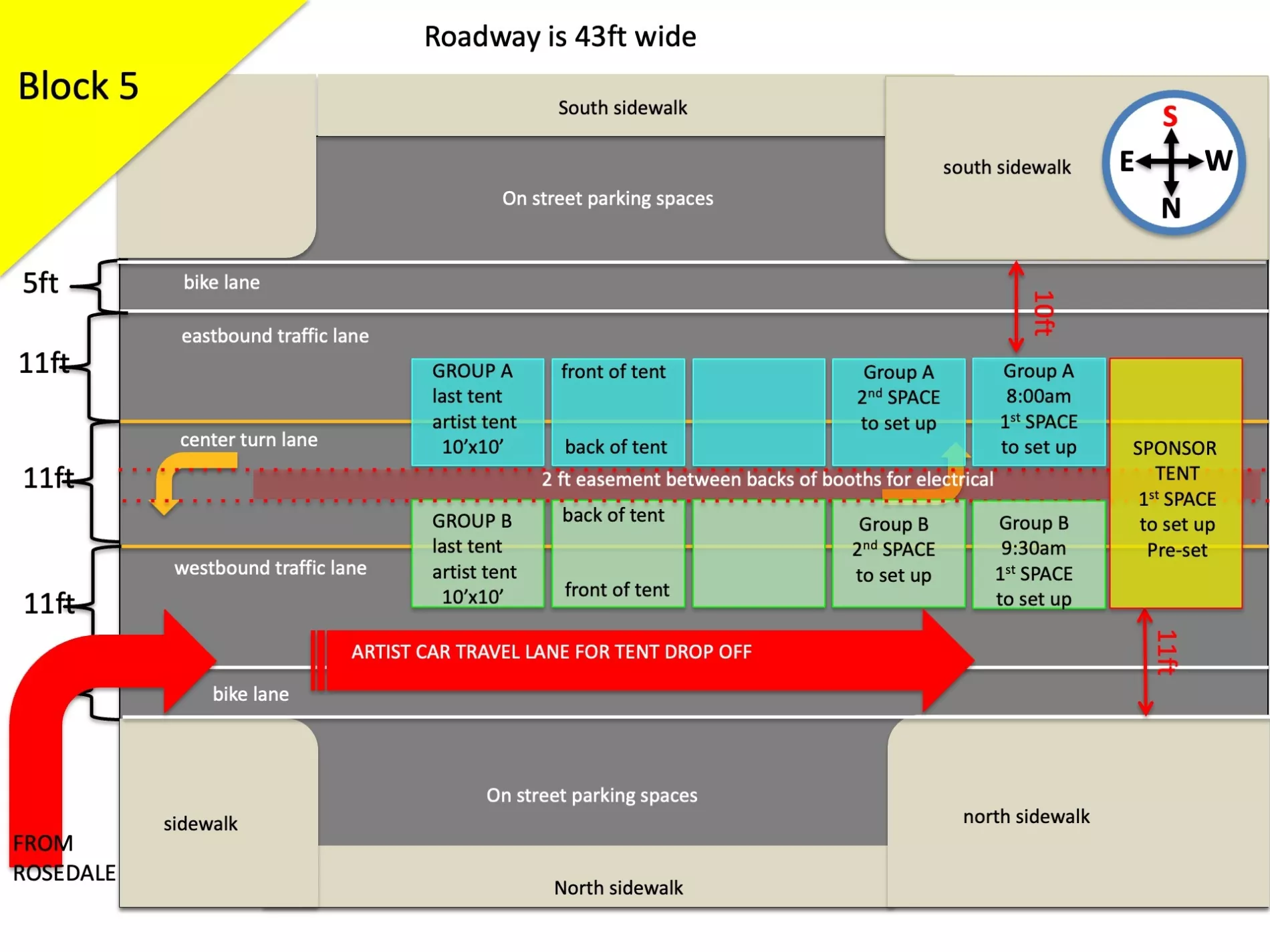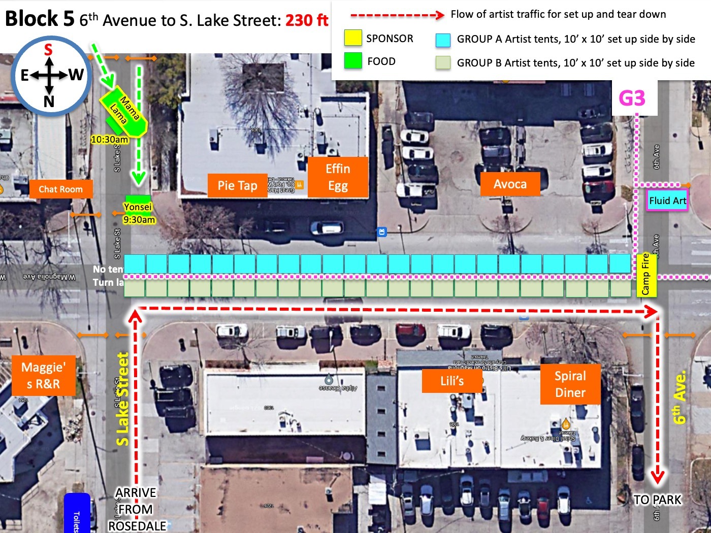 Because of the high volume of car traffic set up will entail, we will be staggering the ARTIST ARRIVAL TIMES in two groups. Please understand that despite your arrival time or your arrival order SPONSOR AND FOOD TENTS have a guarantee to the endcaps they are promised and as they are shown on the map. That means that if a sponsor tent is a bit behind in setting up they will still have the ability to set up on the ends. Please refer to your maps accordingly.