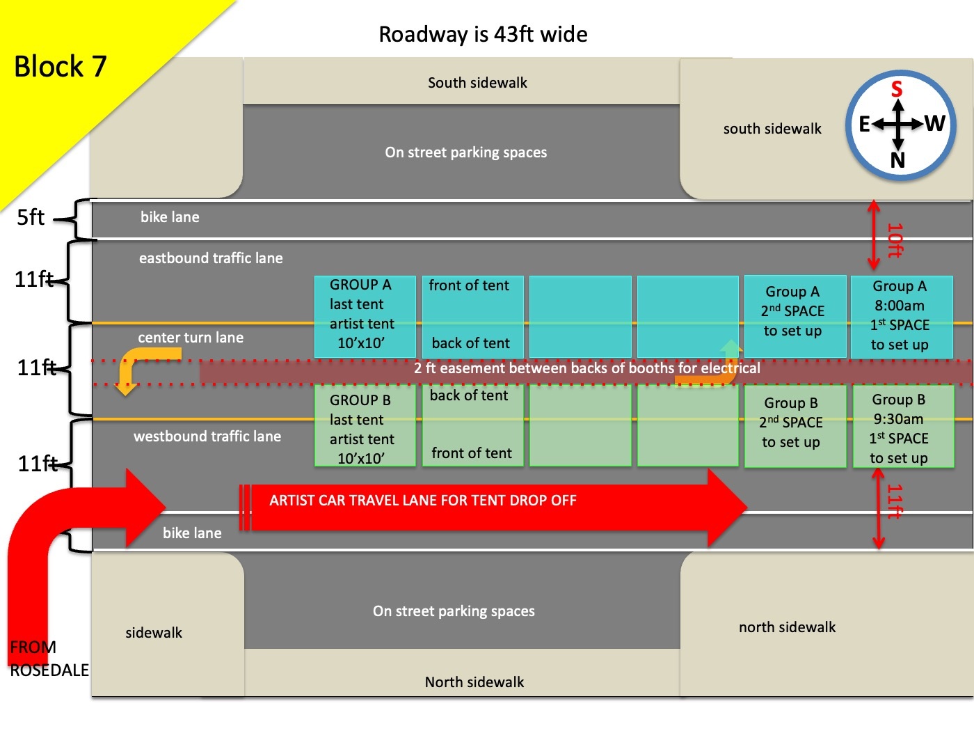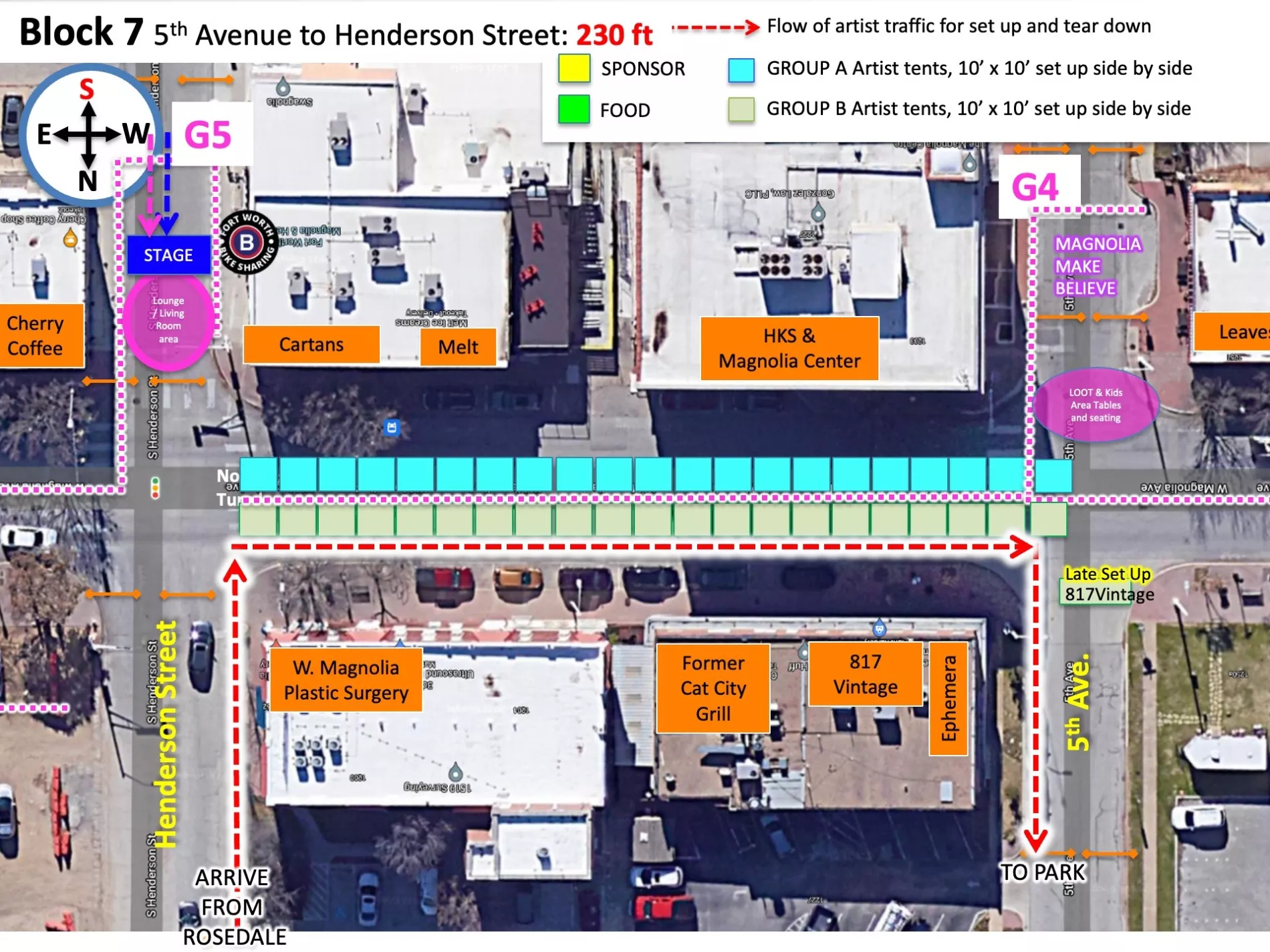 Because of the high volume of car traffic set up will entail, we will be staggering the ARTIST ARRIVAL TIMES in two groups. Please understand that despite your arrival time or your arrival order SPONSOR AND FOOD TENTS have a guarantee to the endcaps they are promised and as they are shown on the map. That means that if a sponsor tent is a bit behind in setting up they will still have the ability to set up on the ends. Please refer to your maps accordingly.