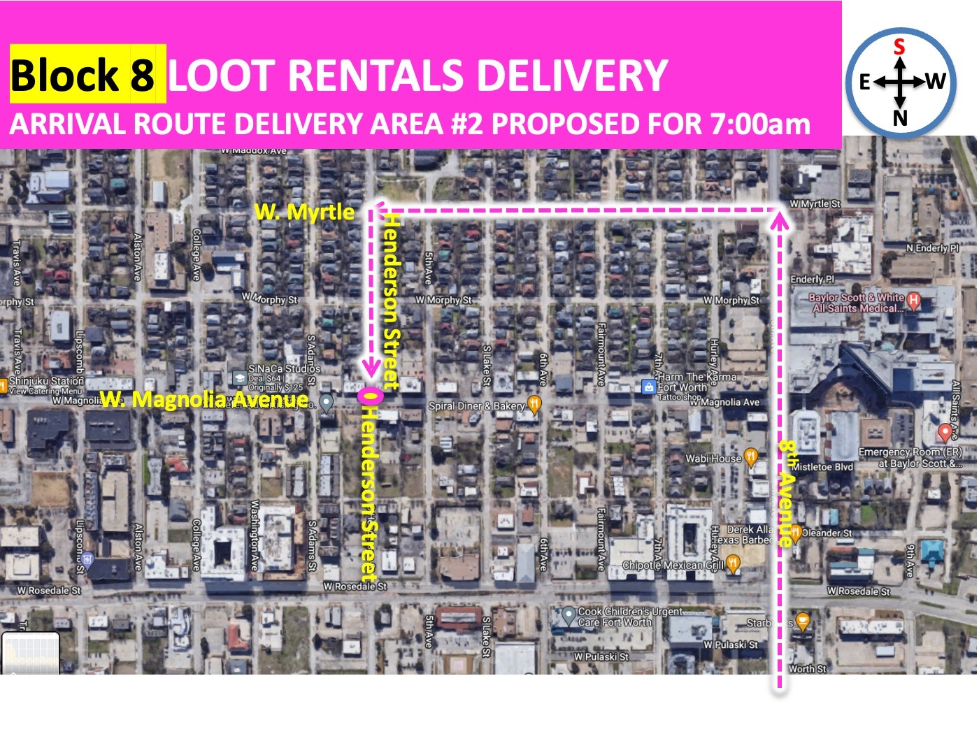 BEGINNING AT 7:00AM the team from Loot Rentals - the official Furniture Sponsor of ArtsGoggle - will begin loading in a treasure trove of furniture that will become the Magnolia Make Believe lounge area. The Loot Rentals partners should follow this map for their arrival. They will be arriving from the south through the Fairmount Neighborhood and this will prevent them from being in conflict with any artist arrivals for this block.