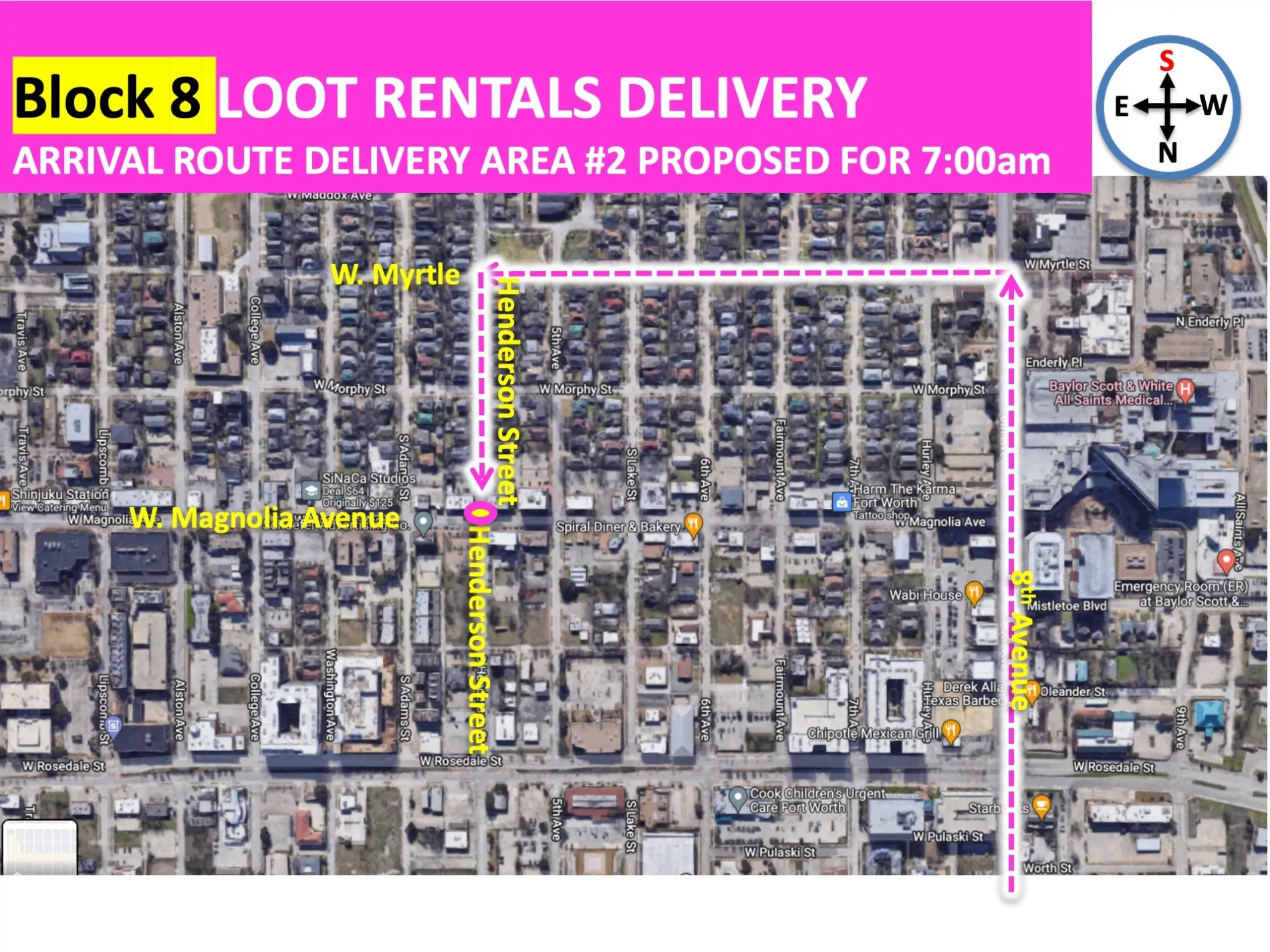 This may feel odd to look at now but when you are driving you will be looking at the map in the very same direction you are pointed in your car. The example maps that we will share here explain how to arrive and what the street will look like to you AS YOU ARRIVE. The maps are facing the same direction (facing south) that your car will be facing (facing south) as you arrive. This is similar to the way that your Apple Map or Google Map will automatically orient itself as you drive, these maps are intentionally oriented to your driving view.