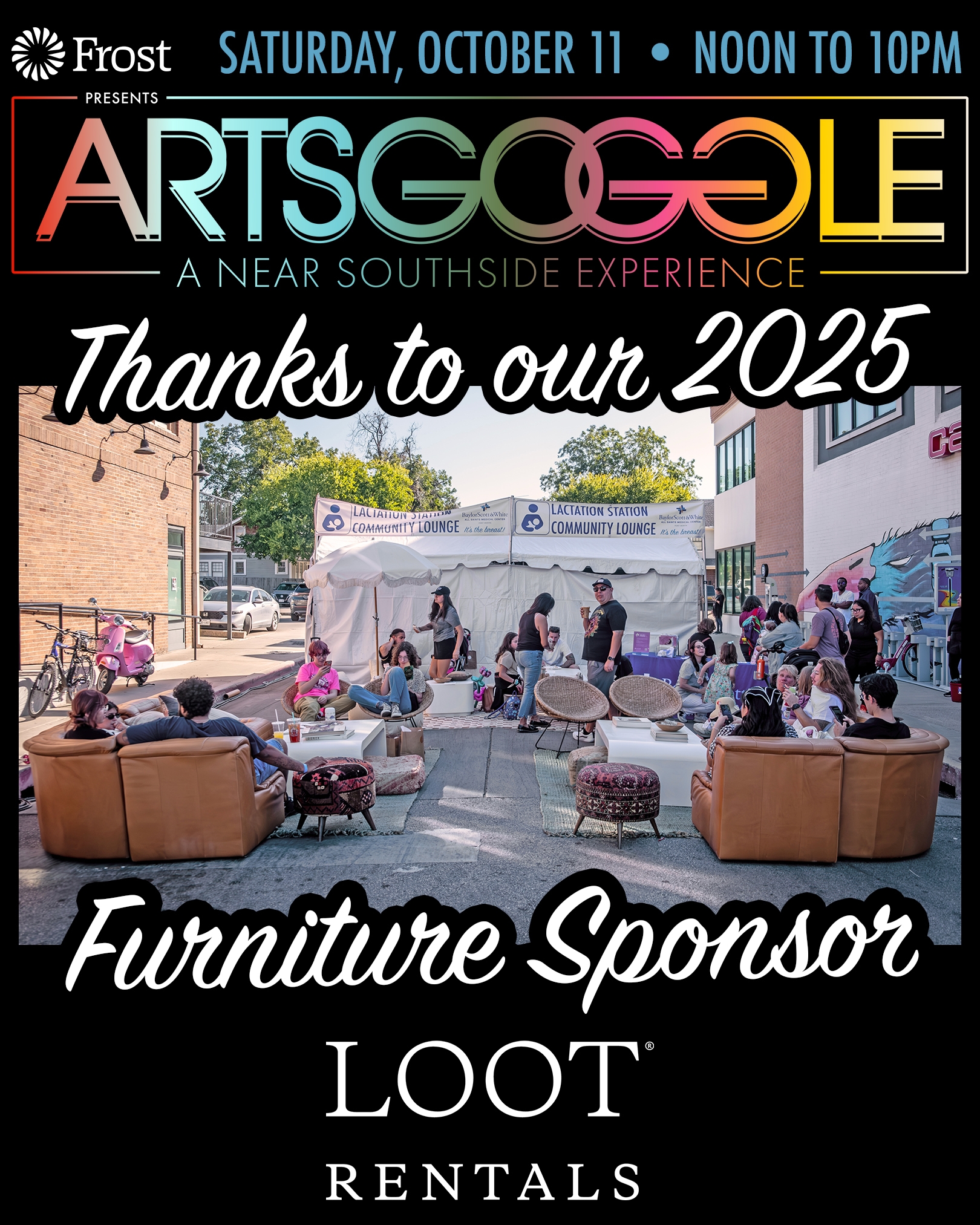 Loot Rentals is Fort Worth and Austin’s design-leading event rental company, known for creating stylish, welcoming spaces. At ArtsGoggle, they will furnish the stages and community hang-out areas with inviting lounges and seating. Festivalgoers can also visit the Loot Rentals tent to connect with the team and experience their one-of-a-kind pieces up close, discovering how they transform gatherings into unforgettable celebrations.