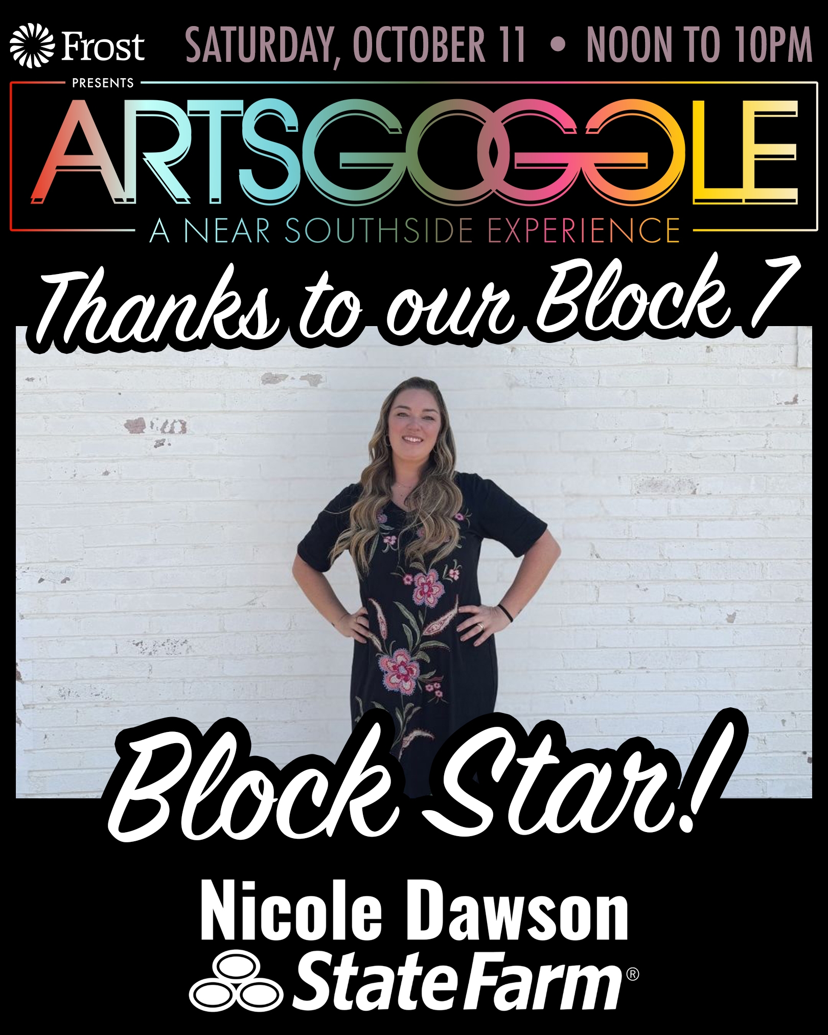Nicole Dawson Insurance Agency by State Farm is Fort Worth’s trusted local agency dedicated to helping families protect what matters most. At ArtsGoggle, they will be the proud Block 7 sponsor from 5th to Henderson. The team will be walking the block, saying hello, and handing out fun giveaways for everyone.